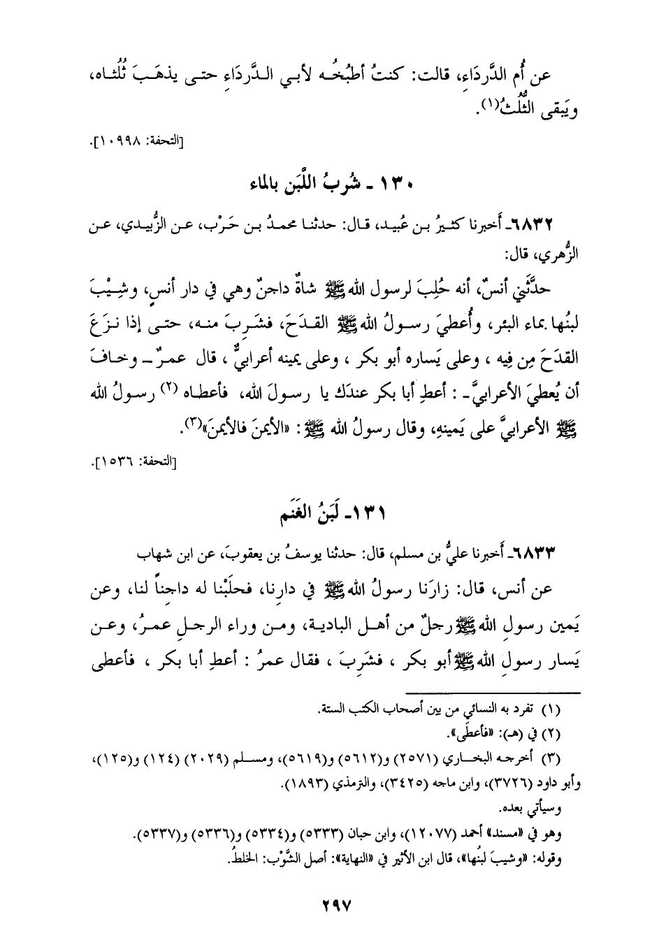 6832 - أَخْبَرَنَا كَثِيرُ بْنُ عُبَيْدٍ، قَالَ: حَدَّثَنَا مُحَمَّدُ بْنُ حَرْبٍ، عَنِ الزُّبَيْدِيِّ، عَنِ الزُّهْرِيِّ، قَالَ: حَدَّثَنِي أَنَسٌ أَنَّهُ حُلِبَ لِرَسُولِ اللهِ صَلَّى اللهُ عَلَيْهِ وَسَلَّمَ، شَاةٌ دَاجِنٌ وَهِيَ فِي دَارِ أَنَسٍ، وَشِيبَ لَبَنُهَا بِمَاءِ الْبِئْرِ، وَأعْطَى رَسُولَ اللهِ صَلَّى اللهُ عَلَيْهِ وَسَلَّمَ: الْقَدَحَ، فَشَرِبَ مِنْهُ حَتَّى إِذَا نَزَعَ الْقَدَحَ مِنْ فِيهِ، وَعَلَى يَسَارِهِ أَبُو بَكْرٍ وَعَلَى يَمِينِهِ أَعْرَابِيٌّ، قَالَ عُمَرُ، وَخَافَ أَنْ يُعْطِيَ الْأَعْرَابِيَّ: أَعْطِ أَبَا بَكْرٍ عِنْدَكَ يَا رَسُولَ اللهِ، §فَأَعْطَاهُ رَسُولُ اللهِ صَلَّى اللهُ عَلَيْهِ وَسَلَّمَ الْأَعْرَابِيَّ عَلَى يَمِينِهِ، وَقَالَ رَسُولُ اللهِ صَلَّى اللهُ عَلَيْهِ وَسَلَّمَ: «الْأَيْمَنَ فَالْأَيْمَنَ»