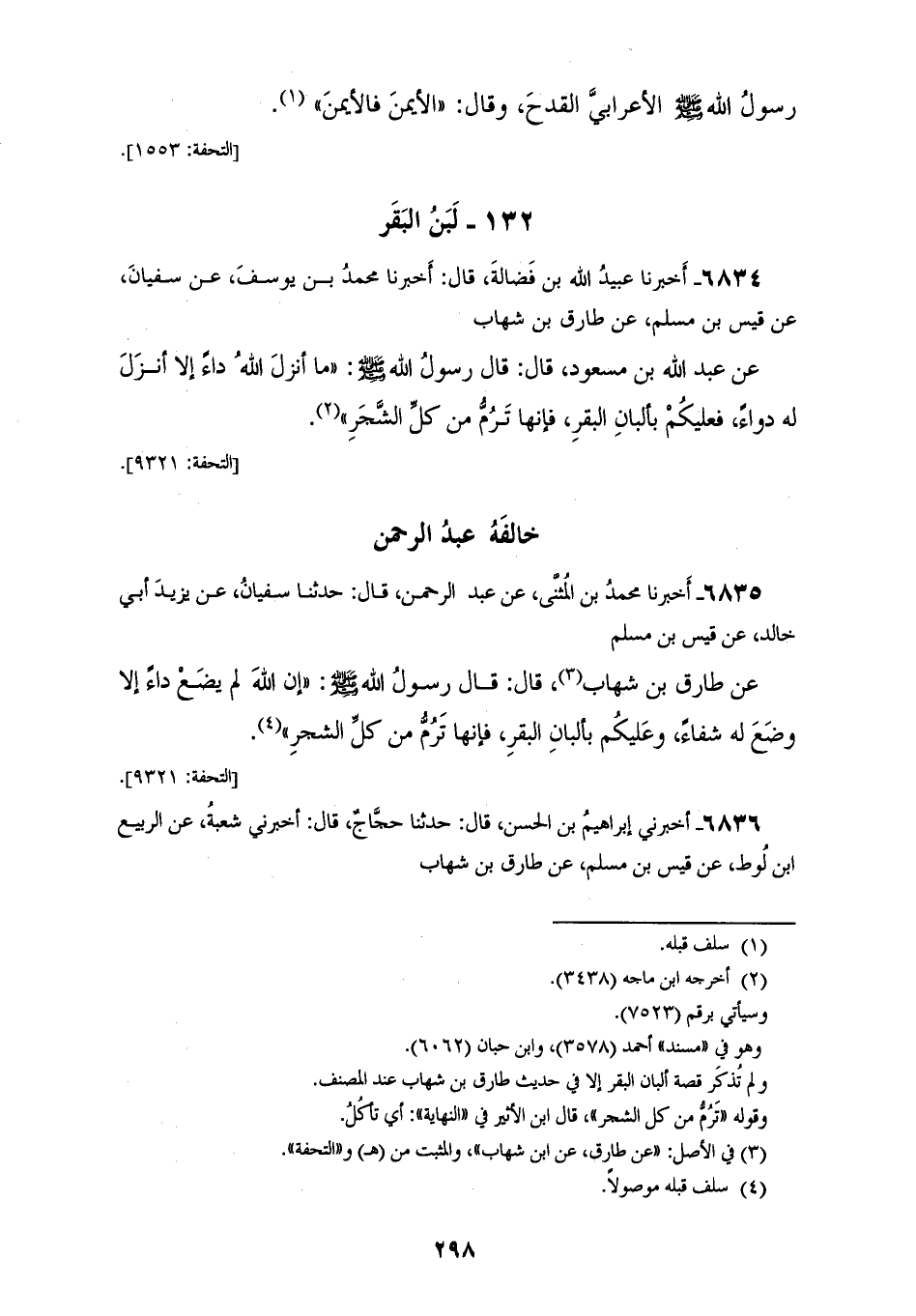 6834 - أَخْبَرَنَا عُبَيْدُ اللهِ بْنُ فَضَالَةَ، قَالَ: أَخْبَرَنَا مُحَمَّدُ بْنُ يُوسُفَ، عَنْ سُفْيَانَ، عَنْ قَيْسِ بْنِ مُسْلِمٍ، عَنْ طَارِقٍ بْنِ شِهَابٍ، عَنْ عَبْدِ اللهِ بْنِ مَسْعُودٍ، قَالَ: قَالَ رَسُولُ اللهِ صَلَّى اللهُ عَلَيْهِ وَسَلَّمَ: «§مَا أَنْزَلَ اللهُ دَاءً إِلَّا أَنْزَلَ لَهُ دَوَاءً، فَعَلَيْكُمْ بِأَلْبَانِ الْبَقَرِ؛ فَإِنَّهَا تَرِمُّ مِنْ كُلِّ الشَّجَرِ» خَالَفَهُ عَبْدُ الرَّحْمَنِ