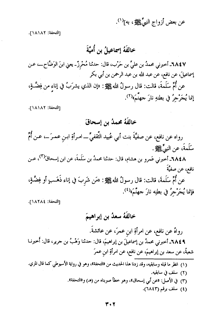 6848 - أَخْبَرَنِي عَمْرُو بْنُ هِشَامٍ، قَالَ: حَدَّثَنَا مُحَمَّدُ بْنُ سَلَمَةَ، عَنْ ابْنِ إِسْحَاقَ، عَنْ نَافِعٍ، عَنْ صَفِيَّةَ، عَنْ أُمِّ سَلَمَةَ، قَالَتْ: قَالَ رَسُولُ اللهِ صَلَّى اللهُ عَلَيْهِ وَسَلَّمَ: «§مَنْ شَرِبَ فِي إِنَاءِ ذَهَبٍ أَوْ فِضَّةٍ فَإِنَّمَا يُجَرْجِرُ فِي بَطْنِهِ نَارَ جَهَنَّمَ» خَالَفَهُ سَعْدُ بْنُ إِبْرَاهِيمَ رَوَاهُ عَنْ نَافِعٍ، عَنِ امْرَأَةِ ابْنِ عُمَرَ، عَنْ عَائِشَةَ