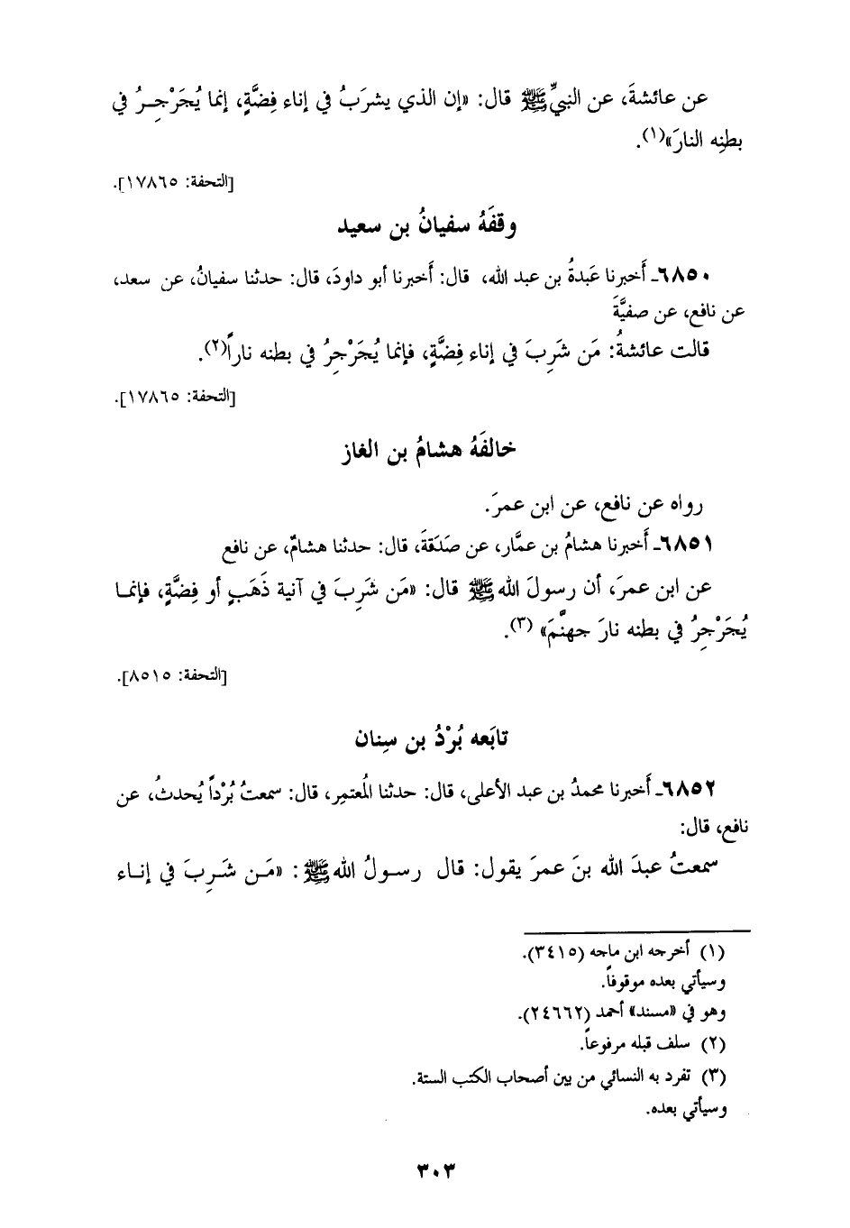 6851 - أَخْبَرَنَا هِشَامُ بْنُ عَمَّارٍ، عَنْ صَدَقَةَ، قَالَ: حَدَّثَنَا هِشَامٌ، عَنْ نَافِعٍ، عَنِ ابْنِ عُمَرَ، أَنَّ رَسُولَ اللهِ صَلَّى اللهُ عَلَيْهِ وَسَلَّمَ قَالَ: «§مَنْ شَرِبَ فِي آنِيَةِ ذَهَبٍ، أَوْ فِضَّةٍ فَإِنَّمَا يُجَرْجِرُ فِي بَطْنِهِ نَارَ جَهَنَّمَ» تَابَعَهُ بُرْدُ بْنُ سِنَانٍ