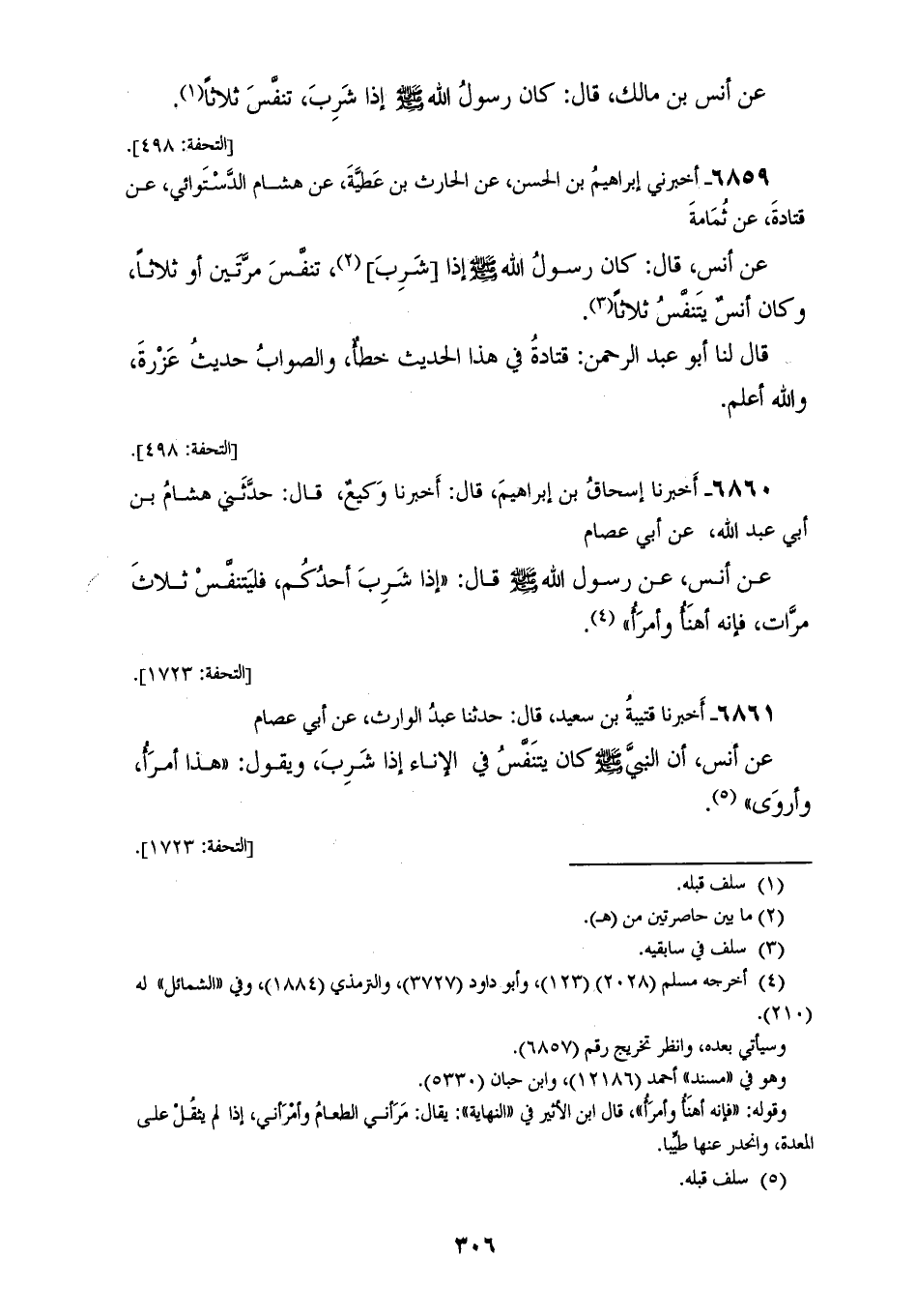 6859 - أَخْبَرَنِي إِبْرَاهِيمُ بْنُ الْحَسَنِ، عَنِ الْحَارِثِ بْنِ عَطِيَّةَ، عَنْ هِشَامٍ الدَّسْتُوَائِيِّ، عَنْ قَتَادَةَ، عَنْ ثُمَامَةَ، عَنْ أَنَسٍ قَالَ: كَانَ رَسُولُ اللهِ صَلَّى اللهُ عَلَيْهِ وَسَلَّمَ: «§إِذَا شَرِبَ تَنَفَّسَ مَرَّتَيْنِ أَوْ ثَلَاثًا، وَكَانَ أَنَسٌ يَتَنَفَّسُ ثَلَاثًا» قَالَ لَنَا أَبُو عَبْدِ الرَّحْمَنِ: قَتَادَةَ فِي هَذَا الْحَدِيثِ خَطَأٌ، وَالصَّوَابُ حَدِيثُ عَزْرَةَ وَاللهُ أَعْلَمَ
