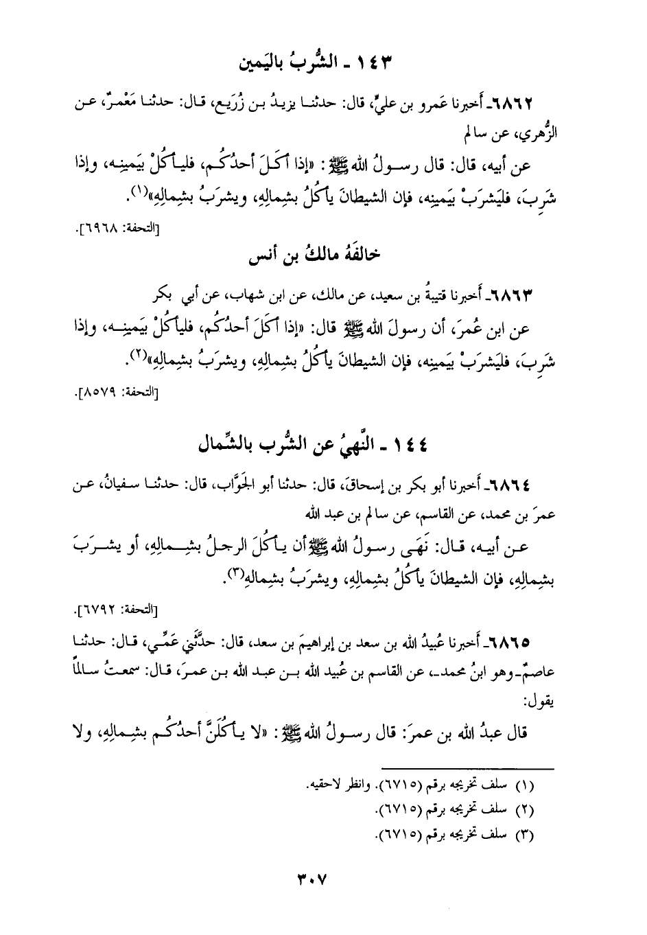 6863 - أَخْبَرَنَا قُتَيْبَةُ بْنُ سَعِيدٍ، عَنْ مَالِكٍ، عَنِ ابْنِ شِهَابٍ، عَنْ أَبِي بَكْرٍ، عَنِ ابْنِ عُمَرَ، أَنَّ رَسُولَ اللهِ صَلَّى اللهُ عَلَيْهِ وَسَلَّمَ قَالَ: «§إِذَا أَكَلَ أَحَدُكُمْ فَلْيَأْكُلْ بِيَمِينِهِ، وَإِذَا شَرِبَ فَلْيَشْرَبْ بِيَمِينِهِ، فَإِنَّ الشَّيْطَانَ يَأْكُلُ بِشِمَالِهِ، وَيَشْرَبُ بِشِمَالِهِ»