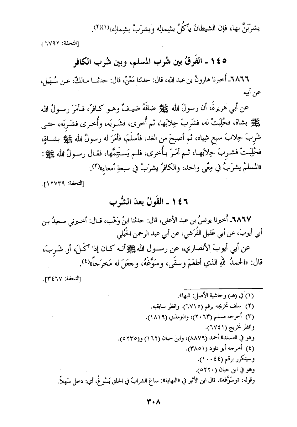 6866 - أَخْبَرَنَا هَارُونُ بْنُ عَبْدِ اللهِ، قَالَ: حَدَّثَنَا مَعْنٌ، قَالَ: حَدَّثَنَا مَالِكٌ، عَنْ سُهَيْلٍ، عَنْ أَبِيهِ، عَنْ أَبِي هُرَيْرَةَ، أَنَّ رَسُولَ اللهِ صَلَّى اللهُ عَلَيْهِ وَسَلَّمَ ضَافَهُ ضَيْفٌ، وَهُوَ كَافِرٌ، فَأَمَرَ رَسُولُ اللهِ صَلَّى اللهُ عَلَيْهِ وَسَلَّمَ بِشَاةٍ، فَحَلَبَتْ لَهُ، فَشَرِبَ حِلَابَهَا، ثُمَّ أُخْرَى فَشَرِبَهُ، وَأُخْرَى فَشَرِبَهُ، حَتَّى شَرِبَ حِلَابَ سَبْعِ شِيَاهٍ، ثُمَّ أَصْبَحَ مِنَ الْغَدِ، فَأَسْلَمَ، فَأَمَرَ لَهُ رَسُولُ اللهِ صَلَّى اللهُ عَلَيْهِ وَسَلَّمَ بِشَاةٍ، فَحُلِبَتْ، فَشَرِبَ حِلَابَهَا، ثُمَّ أَمَرَ بِأُخْرَى فَلَمْ يَسْتَتِمَّهَا، فَقَالَ رَسُولُ اللهِ صَلَّى اللهُ عَلَيْهِ وَسَلَّمَ: «§الْمُسْلِمُ يَشْرَبُ فِي مَعِيٍّ وَاحِدٍ، وَالْكَافِرُ يَشْرَبُ فِي سَبْعَةِ أَمْعَاءٍ»