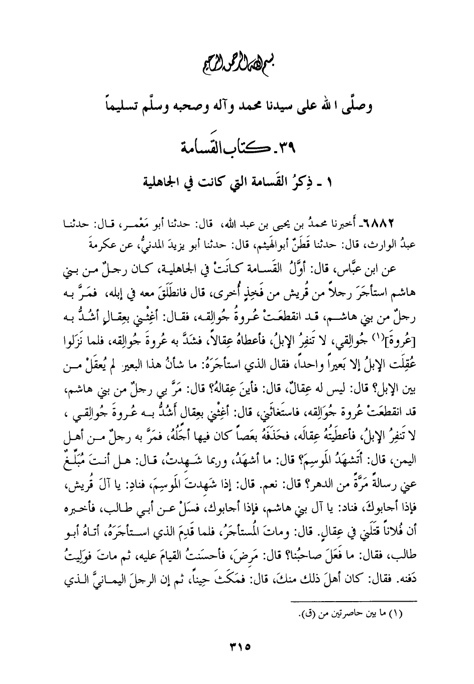 6882 - أَخْبَرَنَا مُحَمَّدُ بْنُ يَحْيَى بْنِ عَبْدِ اللهِ، قَالَ: حَدَّثَنَا أَبُو مَعْمَرٍ، قَالَ: حَدَّثَنَا عَبْدُ الْوَارِثِ، قَالَ: حَدَّثَنَا قَطَنٌ أَبُو الْهَيْثَمِ، قَالَ: حَدَّثَنَا أَبُو يَزِيدَ الْمَدَنِيُّ، عَنْ عِكْرِمَةَ، عَنِ ابْنِ عَبَّاسٍ، قَالَ: أَوَّلُ قَسَامَةٍ كَانَتْ فِي الْجَاهِلِيَّةِ كَانَ رَجُلٌ مِنْ بَنِي هَاشِمٍ، اسْتَأْجَرَ رَجُلًا مِنْ قُرَيْشٍ مِنْ فَخِذٍ أُخْرَى، قَالَ: فَانْطَلَقَ مَعَهُ فِي إِبِلِهِ، فَمَرَّ بِهِ رَجُلٌ مِنْ بَنِي هَاشِمٍ قَدِ انْقَطَعَتْ عُرْوَةُ جُوَالِقِهِ، فَقَالَ: أَغِثْنِي بِعِقَالٍ أَشُدُّ بِهِ عُرْوَةَ جُوَالِقِي، لَا تَنْفِرُ الْإِبِلُ، فَأَعْطَاهُ عِقَالًا، فَشَدَّ بِهِ عُرْوَةَ جُوَالِقِهِ، فَلَمَّا نَزَلُوا عُقِلَتِ الْإِبِلُ إِلَّا بَعِيرًا وَاحِدًا، فَقَالَ الَّذِي اسْتَأْجَرَهُ: مَا شَأْنُ هَذَا الْبَعِيرِ لَمْ يُعْقَلْ مِنْ بَيْنِ الْإِبِلِ، قَالَ: لَيْسَ لَهُ عِقَالٌ، قَالَ: فَأَيْنَ عِقَالُهُ؟ قَالَ: مَرَّ بِي رَجُلٌ مِنْ بَنِي هَاشِمٍ قَدِ انْقَطَعَتْ عُرْوَةُ جُوَالِقِهِ فَاسْتَغَاثَنِي، قَالَ: أَغِثْنِي بِعِقَالٍ أَشُدُّ بِهِ عُرْوَةَ جُوَالِقِي، لَا تَنْفِرُ الْإِبِلُ، فَأَعْطَيْتُهُ عِقَالَهُ، فَحَذَفَهُ بِعَصًا كَانَ فِيهَا أَجَلُهُ، فَمَرَّ بِهِ رَجُلٌ مِنْ أَهْلِ الْيَمَنِ، قَالَ: أَتَشْهَدُ الْمَوْسِمَ؟، قَالَ: مَا أَشْهَدُ، وَرُبَّمَا شَهِدْتُ، قَالَ: هَلْ أَنْتَ مُبَلِّغٌ عَنِّي رِسَالَةً مَرَّةً مِنَ الدَّهْرِ؟ قَالَ: نَعَمْ، قَالَ: إِذَا شَهِدْتَ الْمَوْسِمَ فَنَادِ: يَا آلَ قُرَيْشٍ، فَإِذَا أَجَابُوكَ فَنَادِ: يَا آلَ بَنِي هَاشِمٍ، فَإِذَا أَجَابُوكَ فَسَلْ عَنْ أَبِي طَالِبٍ -[316]-، فَأَخْبِرْهُ أَنَّ فُلَانًا قَتَلَنِي فِي عِقَالٍ، قَالَ: وَمَاتَ الْمُسْتَأْجَرُ، فَلَمَّا قَدِمَ الَّذِي اسْتَأْجَرَهُ أَتَاهُ أَبُو طَالِبٍ، فَقَالَ: مَا فَعَلَ صَاحِبُنَا؟ قَالَ: مَرِضَ، فَأَحْسَنْتُ الْقِيَامَ عَلَيْهِ، ثُمَّ مَاتَ فَوَلِيتُ دَفْنَهُ، فَقَالَ: كَانَ أَهْلُ ذَلِكَ مِنْكَ، قَالَ: فَمَكَثَ حِينًا، ثُمَّ إِنَّ الرَّجُلَ الْيَمَانِيَّ، الَّذِي كَانَ أَوْصَى إِلَيْهِ أَنْ يُبَلِّغَ عَنْهُ، وَافَى الْمَوْسِمَ، فَقَالَ: يَا آلَ قُرَيْشٍ، قَالُوا هَذِهِ قُرَيْشٌ، قَالَ: يَا آلَ بَنِي هَاشِمٍ، قَالُوا: هَذِهِ بَنُو هَاشِمٍ، قَالَ: أَيْنَ أَبُو طَالِبٍ؟، قَالُوا: هَذَا أَبُو طَالِبٍ، قَالَ: أَمَرَنِي فُلَانٌ أَنْ أُبَلِّغَكَ رِسَالَةً، أَنَّ فُلَانًا قَتَلَهُ فِي عِقَالٍ، فَأَتَاهُ أَبُو طَالِبٍ فَقَالَ: اخْتَرْ مِنَّا إِحْدَى ثَلَاثٍ: إِنْ شِئْتَ أَنْ تُؤَدِّيَ مِائَةً مِنَ الْإِبِلِ، فَإِنَّكَ قَتَلْتَ صَاحِبَنَا خَطَأً، وَإِنْ شِئْتَ حَلَفَ خَمْسُونَ مِنْ قَوْمِكَ أَنَّكَ لَمْ تَقْتُلْهُ، فَإِنْ أَبَيْتَ قَتَلْنَاكَ بِهِ، فَأَتَى قَوْمَهُ، فَذَكَرَ ذَلِكَ لَهُمْ، فَقَالُوا: نَحْلِفُ، فَأَتَتْهُ امْرَأَةٌ مِنْ بَنِي هَاشِمٍ، كَانَتْ تَحْتَ رَجُلٍ مِنْهُمْ قَدْ وَلَدَتْ لَهُ، فَقَالَتْ: يَا أَبَا طَالِبٍ، أُحِبُّ أَنْ تُجِيزَ ابْنِي هَذَا رَجُلًا مِنَ الْخَمْسِينَ، وَلَا تُصْبِرَ يَمِينَهُ، فَفَعَلَ، فَأَتَاهُ رَجُلٌ مِنْهُمْ، فَقَالَ: يَا أَبَا طَالِبٍ، أَرَدْتَ خَمْسِينَ رَجُلًا أَنْ يَحْلِفُوا مَكَانَ مِائَةٍ مِنَ الْإِبِلِ، يُصِيبُ كُلَّ رَجُلٍ بَعِيرَانِ، فَهَذَانِ بَعِيرَانِ فَاقْبَلْهُمَا عَنِّي، وَلَا تُصْبِرْ يَمِينِي حَيْثُ تُصْبَرُ الْأَيْمَانُ، فَقَبِلَهُمَا، وَجَاءَ ثَمَانِيَةٌ وَأَرْبَعُونَ رَجُلًا حَلَفُوا، قَالَ ابْنُ عَبَّاسٍ: «§فَوَالَّذِي نَفْسِي بِيَدِهِ مَا حَالَ الْحَوْلُ وَمِنَ الثَّمَانِيَةِ وَالْأَرْبَعِينَ عَيْنٌ تَطْرِفُ»