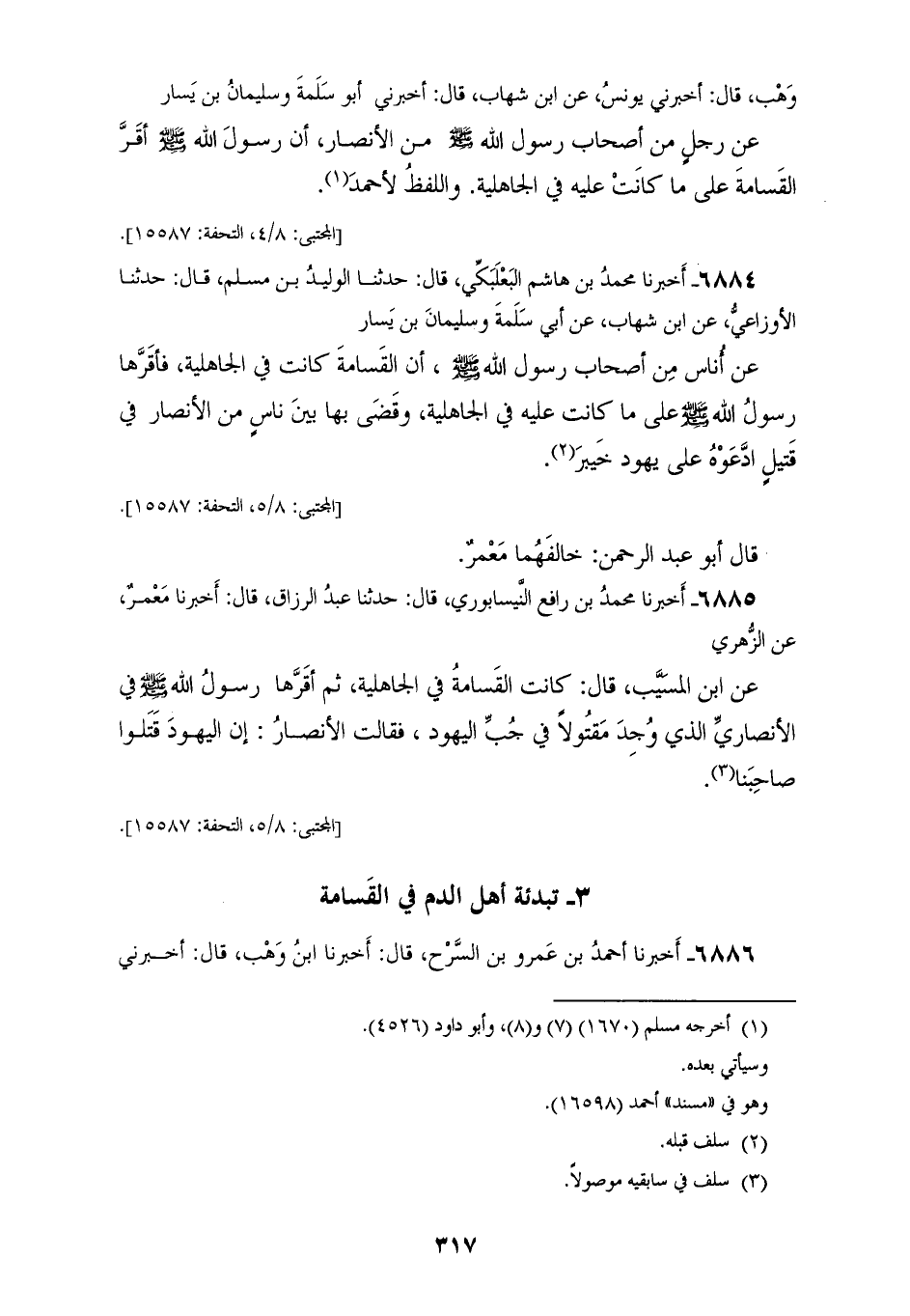 6883 - أَخْبَرَنَا أَحْمَدُ بْنُ عَمْرِو بْنِ السَّرْحِ، وَيُونُسُ بْنُ عَبْدِ الْأَعْلَى، قَالَا: أَخْبَرَنَا ابْنُ وَهْبٍ، قَالَ: أَخْبَرَنِي يُونُسُ، عَنِ ابْنِ شِهَابٍ، قَالَ: أَخْبَرَنِي أَبُو سَلَمَةَ، وَسُلَيْمَانُ بْنُ يَسَارٍ، عَنْ رَجُلٍ، مِنْ أَصْحَابِ رَسُولِ اللهِ صَلَّى اللهُ عَلَيْهِ وَسَلَّمَ مِنَ الْأَنْصَارِ، أَنَّ رَسُولَ اللهِ صَلَّى اللهُ عَلَيْهِ وَسَلَّمَ: «§أَقَرَّ الْقَسَامَةَ عَلَى مَا كَانَتْ عَلَيْهِ فِي الْجَاهِلِيَّةِ» وَاللَّفْظُ لِأَحْمَدَ