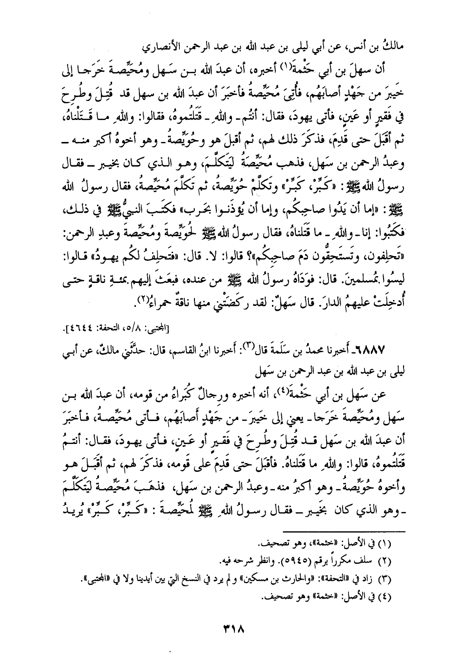 6887 - أَخْبَرَنَا مُحَمَّدُ بْنُ سَلَمَةَ، قَالَ: أَخْبَرَنَا ابْنُ الْقَاسِمِ، قَالَ: حَدَّثَنِي مَالِكٌ، عَنْ أَبِي لَيْلَى بْنِ عَبْدِ اللهِ بْنِ عَبْدِ الرَّحْمَنِ بْنِ سَهْلٍ، عَنْ سَهْلِ بْنِ أَبِي حَثْمَةَ، أَنَّهُ أَخْبَرَهُ وَرِجَالٌ كُبَرَاءُ مِنْ قَوْمِهِ، أَنَّ عَبْدَ، اللهِ بْنَ سَهْلٍ، وَمُحَيِّصَةَ خَرَجَا، يَعْنِي إِلَى خَيْبَرَ مِنْ جَهْدٍ أَصَابَهُمْ، فَأَتَى مُحَيِّصَةُ، فَأَخْبَرَ أَنَّ عَبْدَ اللهِ بْنَ سَهْلٍ قَدْ قُتِلَ، وَطُرِحَ فِي فَقِيرٍ أَوْ عَيْنٍ، فَأَتَى يَهُودَ، فَقَالَ: أَنْتُمْ قَتَلْتُمُوهُ، قَالُوا: وَاللهِ مَا قَتَلْنَاهُ، فَأَقْبَلَ حَتَّى قَدِمَ عَلَى قَوْمِهِ، فَذَكَرَ لَهُمْ، ثُمَّ أَقْبَلَ هُوَ، وَأَخُوهُ حُوَيِّصَةُ، وَهُوَ أَكْبَرُ مِنْهُ، وَعَبْدُ الرَّحْمَنِ بْنُ سَهْلٍ، فَذَهَبَ مُحَيِّصَةُ لِيَتَكَلَّمَ، وَهُوَ الَّذِي كَانَ بِخَيْبَرَ، فَقَالَ رَسُولُ اللهِ صَلَّى اللهُ عَلَيْهِ وَسَلَّمَ لِمُحَيِّصَةَ: «كَبِّرْ كَبِّرْ»، يُرِيدُ السِّنَّ، فَتَكَلَّمَ حُوَيِّصَةُ، ثُمَّ تَكَلَّمَ مُحَيِّصَةُ، فَقَالَ رَسُولُ اللهِ صَلَّى اللهُ عَلَيْهِ وَسَلَّمَ: «إِمَّا أَنْ يَدُوا صَاحِبَكُمْ، وَإِمَّا أَنْ يُؤْذَنُوا بِحَرْبٍ»، فَكَتَبَ إِلَيْهِمْ رَسُولُ اللهِ صَلَّى اللهُ عَلَيْهِ وَسَلَّمَ فِي ذَلِكَ، فَكَتَبُوا: إِنَّا وَاللهِ مَا قَتَلْنَاهُ، فَقَالَ رَسُولُ اللهِ صَلَّى اللهُ عَلَيْهِ وَسَلَّمَ لِحُوَيِّصَةَ، وَمُحَيِّصَةَ، وَعَبْدِ الرَّحْمَنِ: «§تَحْلِفُونَ، وَتَسْتَحِقُّونَ دَمَ صَاحِبِكُمْ؟» قَالُوا: لَا، قَالَ: «فَتَحْلِفُ لَكُمْ يَهُودُ» قَالُوا: لَيْسُوا بِمُسْلِمِينَ، فَوَدَاهُ رَسُولُ اللهِ صَلَّى اللهُ عَلَيْهِ وَسَلَّمَ مِنْ عِنْدِهِ، فَبَعَثَ إِلَيْهِمْ بِمِائَةِ نَاقَةٍ حَتَّى أُدْخِلَتْ عَلَيْهِمُ الدَّارَ، قَالَ سَهْلٌ: لَقَدْ رَكَضَتْنِي مِنْهَا نَاقَةٌ حَمْرَاءُ