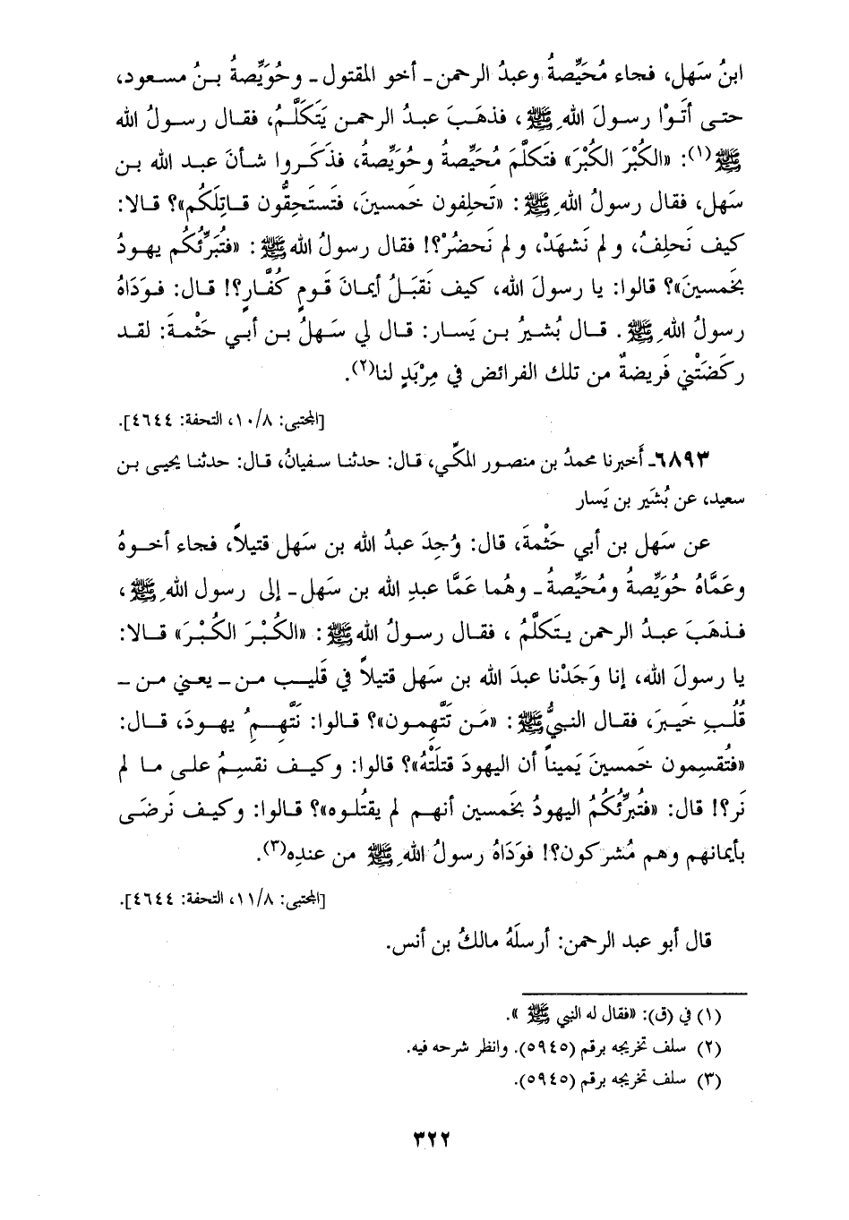 6893 - أَخْبَرَنَا مُحَمَّدُ بْنُ مَنْصُورٍ الْمَكِّيُّ، قَالَ: حَدَّثَنَا سُفْيَانُ، قَالَ: حَدَّثَنَا يَحْيَى بْنُ سَعِيدٍ، عَنْ بُشَيْرِ بْنِ يَسَارٍ، عَنْ سَهْلِ بْنِ أَبِي حَثْمَةَ، قَالَ: وُجِدَ عَبْدُ اللهِ بْنُ سَهْلٍ قَتِيلًا، فَجَاءَ أَخُوهُ، وَعَمَّاهُ حُوَيِّصَةُ، وَمُحَيِّصَةُ، وَهُمَا عَمَّا عَبْدِ اللهِ بْنِ سَهْلٍ إِلَى رَسُولِ اللهِ صَلَّى اللهُ عَلَيْهِ وَسَلَّمَ، فَذَهَبَ عَبْدُ الرَّحْمَنِ يَتَكَلَّمُ، فَقَالَ رَسُولُ اللهِ صَلَّى اللهُ عَلَيْهِ وَسَلَّمَ: «الْكُبْرَ الْكُبْرَ»، قَالَا: يَا رَسُولَ اللهِ، إِنَّا وَجَدْنَا عَبْدَ اللهِ بْنَ سَهْلٍ قَتِيلًا فِي قُلَيْبٍ مِنْ، يَعْنِي مِنْ قُلُبِ خَيْبَرَ، فَقَالَ النَّبِيُّ صَلَّى اللهُ عَلَيْهِ وَسَلَّمَ: «مَنْ تَتَّهِمُونَ؟» قَالُوا: نَتَّهِمُ يَهُودَ، قَالَ: «فَتُقْسِمُونَ خَمْسِينَ يَمِينًا أَنَّ الْيَهُودَ قَتَلَتْهُ؟»، قَالُوا: وَكَيْفَ نُقْسِمُ عَلَى مَا لَمْ نَرَ؟، قَالَ: «فَتُبَرِّئُكُمْ الْيَهُودُ بِخَمْسِينَ، أَنَّهُمْ لَمْ يَقْتُلُوهُ»، قَالُوا: وَكَيْفَ نَرْضَى بِأَيْمَانِهِمْ، وَهُمْ مُشْرِكُونَ؟، فَوَدَاهُ رَسُولُ اللهِ صَلَّى اللهُ عَلَيْهِ وَسَلَّمَ مِنْ عِنْدِهِ قَالَ أَبُو عَبْدِ الرَّحْمَنِ: أَرْسَلَهُ مَالِكُ بْنُ أَنَسٍ