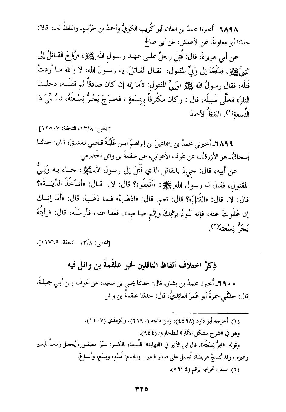 6899 - أَخْبَرَنِي مُحَمَّدُ بْنُ إِسْمَاعِيلَ بْنِ إِبْرَاهِيمَ ابْنِ عُلَيَّةَ، قَاضِي دِمَشْقَ، قَالَ: حَدَّثَنَا إِسْحَاقُ هُوَ الْأَزْرَقُ، عَنْ عَوْفٍ الْأَعْرَابِيِّ، عَنْ عَلْقَمَةَ بْنِ وَائِلٍ الْحَضْرَمِيِّ، عَنْ أَبِيهِ قَالَ: جِيءَ بِالْقَاتِلِ الَّذِي قَتَلَ إِلَى رَسُولِ اللهِ صَلَّى اللهُ عَلَيْهِ وَسَلَّمَ، جَاءَ بِهِ وَلِيُّ الْمَقْتُولِ، فَقَالَ لَهُ رَسُولُ اللهِ صَلَّى اللهُ عَلَيْهِ وَسَلَّمَ: «أَتَعْفُو؟»، قَالَ: لَا، قَالَ: «أَتَأْخُذُ الدِّيَةَ؟»، قَالَ: لَا، قَالَ: «الْقَتْلُ؟»، قَالَ: نَعَمْ، قَالَ: «اذْهَبْ»، فَلَمَّا ذَهَبَ قَالَ: «§أَمَا إِنَّكَ إِنْ عَفَوْتَ عَنْهُ فَإِنَّهُ يَبُوءُ بِإِثْمِكَ، وَإِثْمِ صَاحِبِهِ» فَعَفَا عَنْهُ، فَأَرْسَلَهُ، قَالَ: فَرَأَيْتُهُ يَجُرُّ نِسْعَتَهُ "