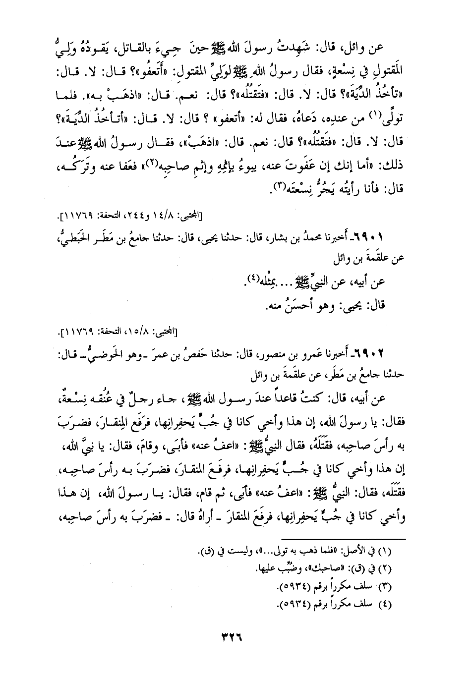 6900 - أَخْبَرَنَا مُحَمَّدُ بْنُ بَشَّارٍ، قَالَ: حَدَّثَنَا يَحْيَى بْنُ سَعِيدٍ، عَنْ عَوْفِ بْنِ أَبِي جَمِيلَةَ، قَالَ: حَدَّثَنِي حَمْزَةُ أَبُو عُمَرَ الْعَائِذِيُّ، قَالَ: حَدَّثَنَا عَلْقَمَةُ بْنُ وَائِلٍ، عَنْ وَائِلٍ، قَالَ: شَهِدْتُ رَسُولَ اللهِ صَلَّى اللهُ عَلَيْهِ وَسَلَّمَ حِينَ جِيءَ بِالْقَاتِلِ، يَقُودُهُ وَلِيُّ الْمَقْتُولِ فِي نِسْعَةٍ، فَقَالَ رَسُولُ اللهِ صَلَّى اللهُ عَلَيْهِ وَسَلَّمَ لِوَلِيِّ الْمَقْتُولِ: «أَتَعْفُو؟»، قَالَ: لَا، قَالَ: «تَأْخُذُ الدِّيَةَ؟»، قَالَ: لَا، قَالَ: «فَتَقْتُلُهُ؟»، قَالَ: نَعَمْ، قَالَ: «اذْهَبْ بِهِ»، فَلَمَّا تَوَلَّى مِنْ عِنْدِهِ دَعَاهُ، فَقَالَ لَهُ: «أَتَعْفُو؟»، قَالَ: لَا، قَالَ: «أَتَأْخُذُ الدِّيَةَ؟»، قَالَ: لَا، قَالَ: «فَتَقْتُلُهُ»، قَالَ: نَعَمْ، قَالَ: «اذْهَبْ»، فَقَالَ رَسُولُ اللهِ صَلَّى اللهُ عَلَيْهِ وَسَلَّمَ عِنْدَ ذَلِكَ: «§أَمَا إِنَّكَ إِنْ عَفَوْتَ عَنْهُ يَبُوءُ بِإِثْمِهِ، وَإِثْمِ صَاحِبِهِ»، فَعَفَا عَنْهُ وَتَرَكَهُ، قَالَ: فَأَنَا رَأَيْتُهُ يَجُرُّ نِسْعَتَهُ "