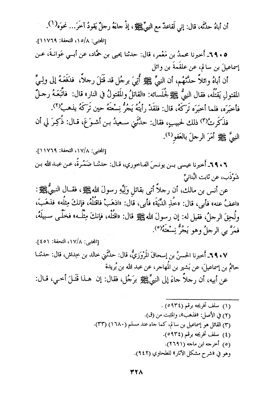 6905 - أَخْبَرَنَا مُحَمَّدُ بْنُ مَعْمَرٍ، قَالَ: حَدَّثَنَا يَحْيَى بْنُ حَمَّادٍ، عَنْ أَبِي عَوَانَةَ، عَنْ إِسْمَاعِيلَ بْنِ سَالِمٍ، عَنْ عَلْقَمَةَ بْنِ وَائِلٍ، أَنَّ أَبَاهُ وَائِلًا، حَدَّثَهُمُ أَنَّ النَّبِيَّ صَلَّى اللهُ عَلَيْهِ وَسَلَّمَ أُتِيَ بِرَجُلٍ قَدْ قَتَلَ رَجُلًا، فَدَفَعَهُ إِلَى وَلِيِّ الْمَقْتُولِ يَقْتُلُهُ، فَقَالَ النَّبِيُّ صَلَّى اللهُ عَلَيْهِ وَسَلَّمَ لِجُلَسَائِهِ: «§الْقَاتِلُ وَالْمَقْتُولُ فِي النَّارِ» قَالَ: فَاتَّبَعَهُ رَجُلٌ، فَأَخْبَرَهُ، فَلَمَّا أَخْبَرَهُ تَرَكَهُ، قَالَ: فَلَقَدْ رَأَيْتُهُ يَجُرُّ نِسْعَتَهُ حِينَ تَرَكَهُ يَذْهَبُ، فَذَكَرْتُ ذَلِكَ لِحَبِيبٍ، فَقَالَ: حَدَّثَنِي سَعِيدُ بْنُ أَشْوَعَ، قَالَ: ذَكَرَ لِي أَنَّ النَّبِيَّ صَلَّى اللهُ عَلَيْهِ وَسَلَّمَ أَمَرَ الرَّجُلَ بِالْعَفْوِ