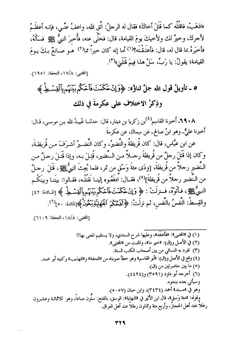 6908 - أَخْبَرَنَا الْقَاسِمُ بْنُ زَكَرِيَّا بْنِ دِينَارٍ، قَالَ: حَدَّثَنَا عُبَيْدُ اللهِ بْنُ مُوسَى، قَالَ: أَخْبَرَنَا عَلِيٌّ وَهُوَ ابْنُ صَالِحٍ، عَنْ سِمَاكٍ، عَنْ عِكْرِمَةَ، عَنِ ابنِ عَبَّاسٍ، قَالَ: كَانَ قُرَيْظَةُ وَالنَّضِيرُ، وَكَانَ النَّضِيرُ أَشْرَفَ مِنْ قُرَيْظَةَ، وَكَانَ إِذَا قَتَلَ رَجُلٌ مِنْ قُرَيْظَةَ رَجُلًا مِنَ النَّضِيرِ قُتِلَ بِهِ، وَإِذَا قَتَلَ رَجُلٌ مِنَ النَّضِيرِ رَجُلًا مِنْ قُرَيْظَةَ وَدَى مِائَةَ وَسْقٍ مِنْ تَمْرٍ، فَلَمَّا بُعِثَ النَّبِيُّ صَلَّى اللهُ عَلَيْهِ وَسَلَّمَ قَتَلَ رَجُلٌ مِنَ النَّضِيرِ رَجُلًا مِنْ قُرَيْظَةَ، فَقَالَ: ادْفَعُوهُ إِلَيْنَا نَقْتُلْهُ، فَقَالُوا: بَيْنَنَا وَبَيْنَكُمُ النَّبِيُّ صَلَّى اللهُ عَلَيْهِ وَسَلَّمَ، فَأَتَوْهُ: " §فَنَزَلَتْ {وَإِنْ حَكَمْتَ فَاحْكُمْ بَيْنَهُمْ بِالْقِسْطِ} [المائدة: 42] وَالْقِسْطُ النَّفْسُ بِالنَّفْسِ، ثُمَّ نَزَلَتْ {أَفَحُكْمَ الْجَاهِلِيَّةِ يَبْغُونَ} [المائدة: 50]