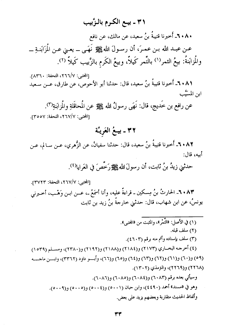 6082 - أَخْبَرَنَا قُتَيْبَةُ بْنُ سَعِيدٍ، قَالَ: حَدَّثَنَا سُفْيَانُ، عَنِ الزُّهْرِيِّ، عَنْ سَالِمٍ، عَنْ أَبِيهِ، قَالَ: حَدَّثَنِي زَيْدُ بْنُ ثَابِتٍ، أَنَّ رَسُولَ اللهِ صَلَّى اللهُ عَلَيْهِ وَسَلَّمَ §رَخَّصَ فِي الْعَرَايَا