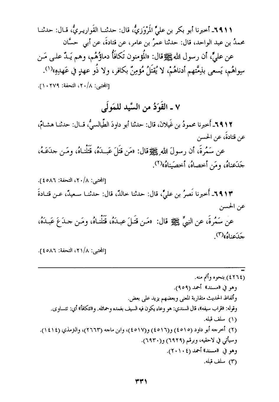 6911 - أَخْبَرَنَا أَبُو بَكْرِ بْنُ عَلِيٍّ الْمَرْوَزِيُّ، قَالَ: حَدَّثَنَا الْقَوَارِيرِيُّ، قَالَ: حَدَّثَنَا مُحَمَّدُ بْنُ عَبْدِ الْوَاحِدِ، قَالَ: حَدَّثَنَا عُمَرُ بْنُ عَامِرٍ، عَنْ قَتَادَةَ، عَنْ أَبِي حَسَّانَ، عَنْ عَلِيٍّ، أَنَّ رَسُولَ اللهِ صَلَّى اللهُ عَلَيْهِ وَسَلَّمَ، قَالَ: «§الْمُؤْمِنُونَ تَكَافَأُ دِمَاؤُهُمْ، وَهُمْ يَدٌ عَلَى مَنْ سِوَاهُمْ، يَسْعَى بِذِمَّتِهِمْ أَدْنَاهُمْ، لَا يُقْتَلُ مُؤْمِنٌ بِكَافِرٍ، وَلَا ذُو عَهْدٍ فِي عَهْدِهِ»