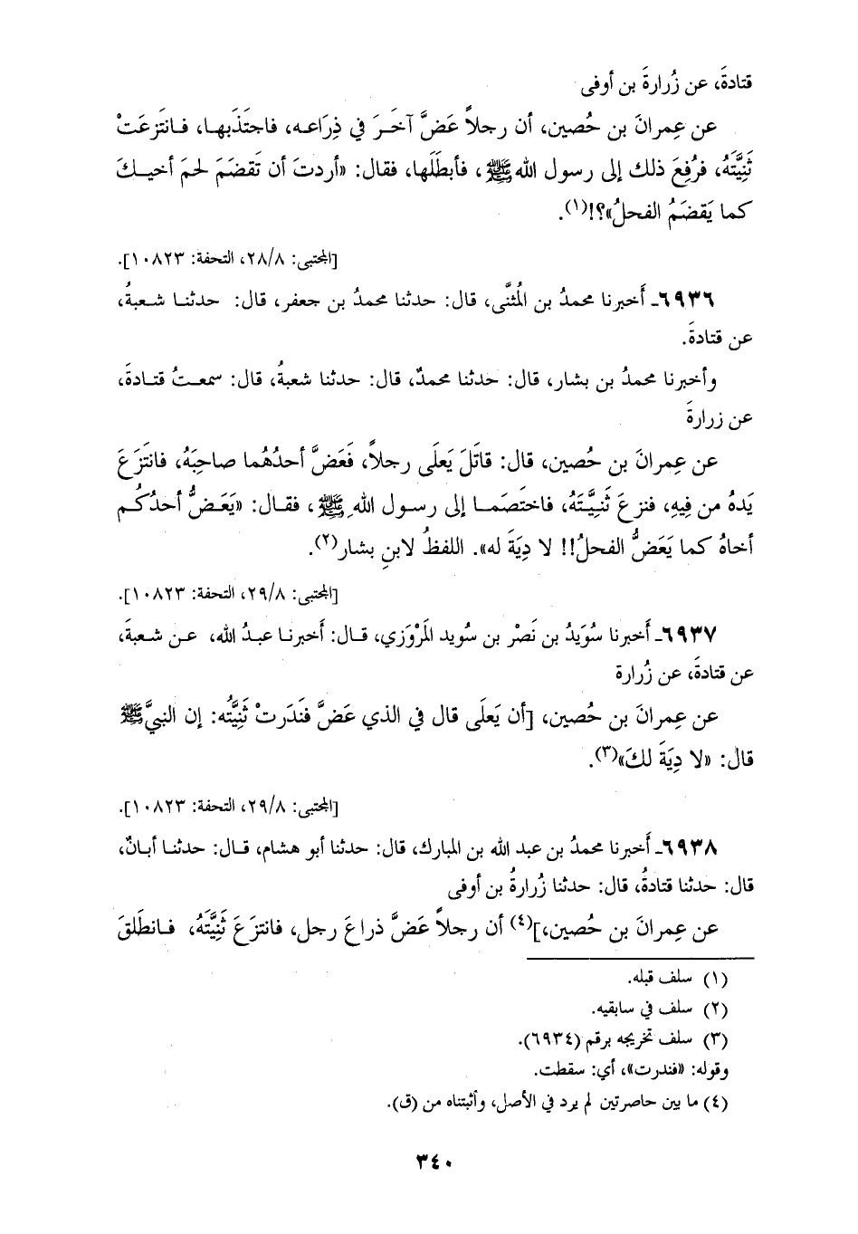 6935 - أَخْبَرَنَا عَمْرُو بْنُ عَلِيٍّ، قَالَ: حَدَّثَنَا يَزِيدُ، قَالَ: حَدَّثَنَا سَعِيدُ بْنُ أَبِي عَرُوبَةَ، عَنْ قَتَادَةَ، عَنْ زُرَارَةَ بْنِ أَوْفَى، عَنْ عِمْرَانَ بْنِ حُصَيْنٍ، أَنَّ رَجُلًا عَضَّ آخَرَ فِي ذِرَاعِهِ، فَاجْتَذَبَهَا فَانْتَزَعَتْ ثَنِيَّتَهُ، فَرُفِعَ ذَلِكَ إِلَى رَسُولِ اللهِ صَلَّى اللهُ عَلَيْهِ وَسَلَّمَ، فَأَبْطَلَهَا، فَقَالَ: «§أَرَدْتَ أَنْ تَقْضَمَ لَحْمَ أَخِيكَ كَمَا يَقْضَمُ الْفَحْلُ»