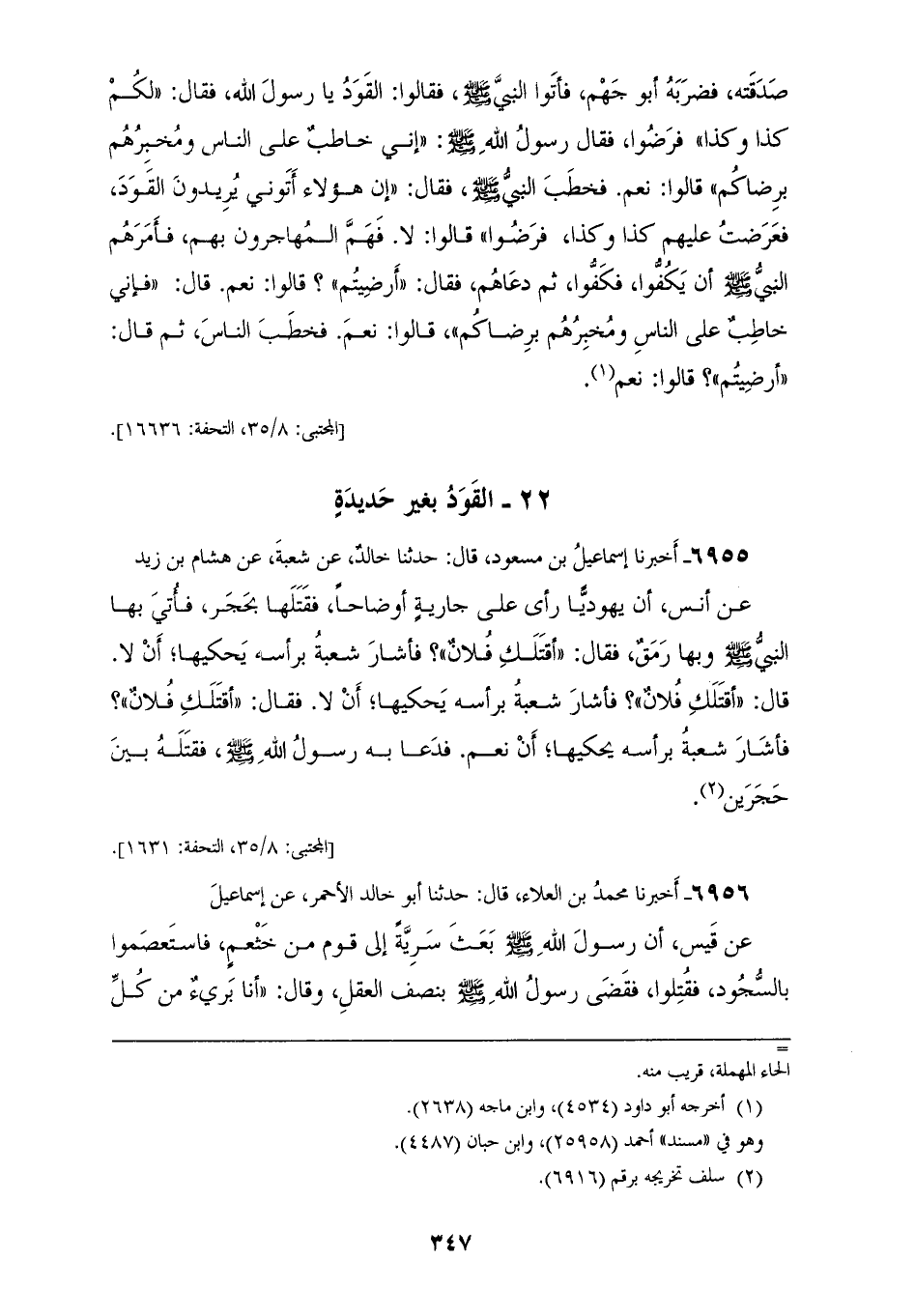 6955 - أَخْبَرَنَا إِسْمَاعِيلُ بْنُ مَسْعُودٍ، قَالَ: حَدَّثَنَا خَالِدٌ، عَنْ شُعْبَةَ، عَنْ هِشَامِ بْنِ زَيْدٍ، عَنْ أَنَسٍ أَنَّ يَهُودِيًّا رَأَى عَلَى جَارِيَةٍ أَوْضَاحًا فَقَتَلَهَا بِحَجَرٍ، فَأُتِيَ بِهَا النَّبِيُّ صَلَّى اللهُ عَلَيْهِ وَسَلَّمَ، وَبِهَا رَمَقٌ، فَقَالَ: «أَقَتَلَكِ فُلَانٌ؟»، فَأَشَارَ شُعْبَةُ بِرَأْسِهِ يَحْكِيهَا أَنْ لَا، قَالَ: «أَقَتَلَكِ فُلَانٌ؟» فَأَشَارَ شُعْبَةُ بِرَأْسِهِ يَحْكِيهَا أَنْ لَا، فَقَالَ: «أَقَتَلَكِ فُلَانٌ؟»، فَأَشَارَ شُعْبَةُ بِرَأْسِهِ يَحْكِيهَا أَنْ نَعَمْ: «§فَدَعَا بِهِ رَسُولُ اللهِ صَلَّى اللهُ عَلَيْهِ وَسَلَّمَ، فَقَتَلَهُ بَيْنَ حَجَرَيْنِ»