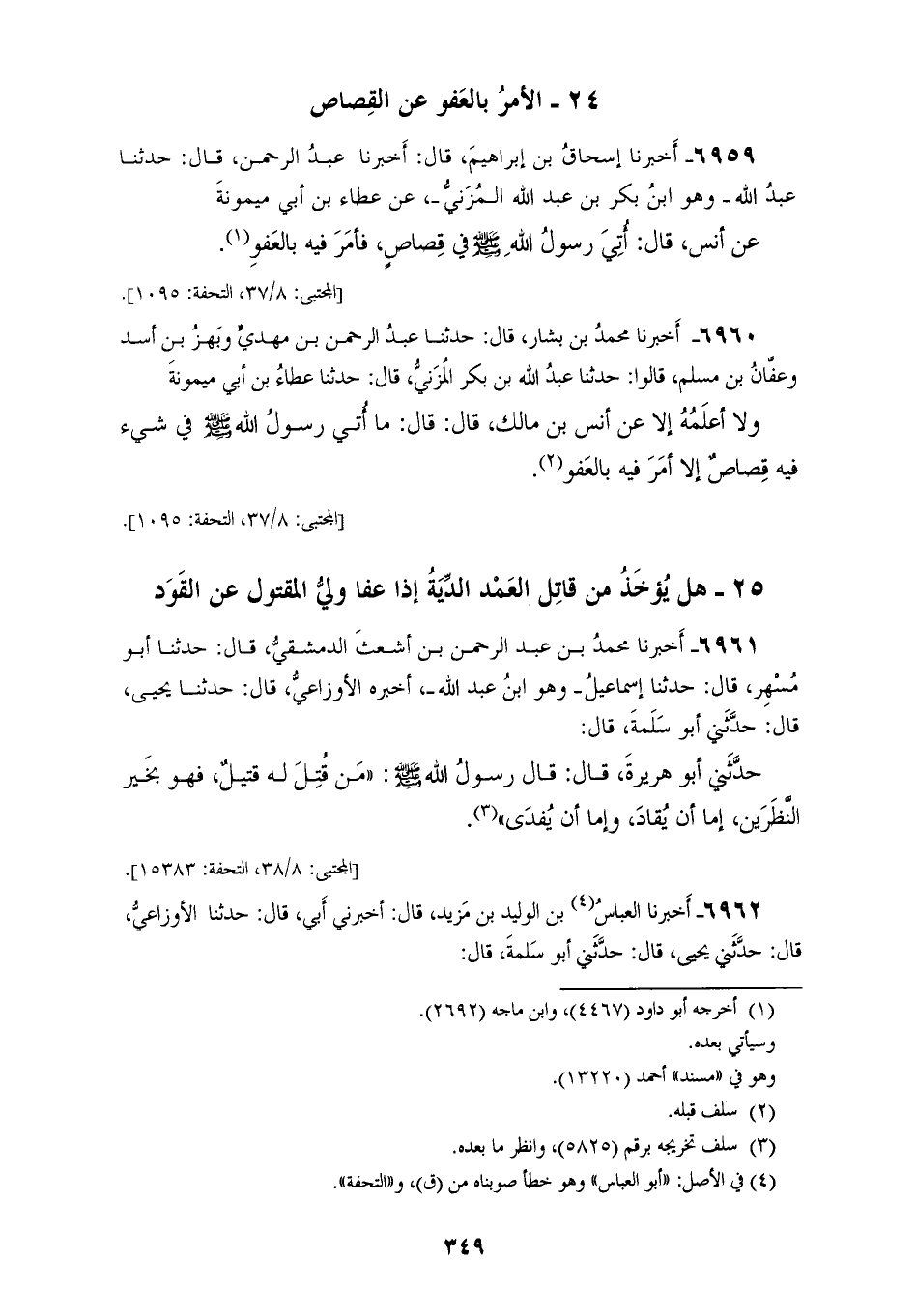 6959 - أَخْبَرَنَا إِسْحَاقُ بْنُ إِبْرَاهِيمَ، قَالَ: أَخْبَرَنَا عَبْدُ الرَّحْمَنِ، قَالَ: حَدَّثَنَا عَبْدُ اللهِ وَهُوَ ابْنُ بَكْرِ بْنِ عَبْدِ اللهِ الْمُزَنِيُّ، عَنْ عَطَاءِ بْنِ أَبِي مَيْمُونَةَ، عَنْ أَنَسٍ، قَالَ: «§أُتِيَ رَسُولُ اللهِ صَلَّى اللهُ عَلَيْهِ وَسَلَّمَ، فِي قِصَاصٍ فَأَمَرَ فِيهِ بِالْعَفْوِ»