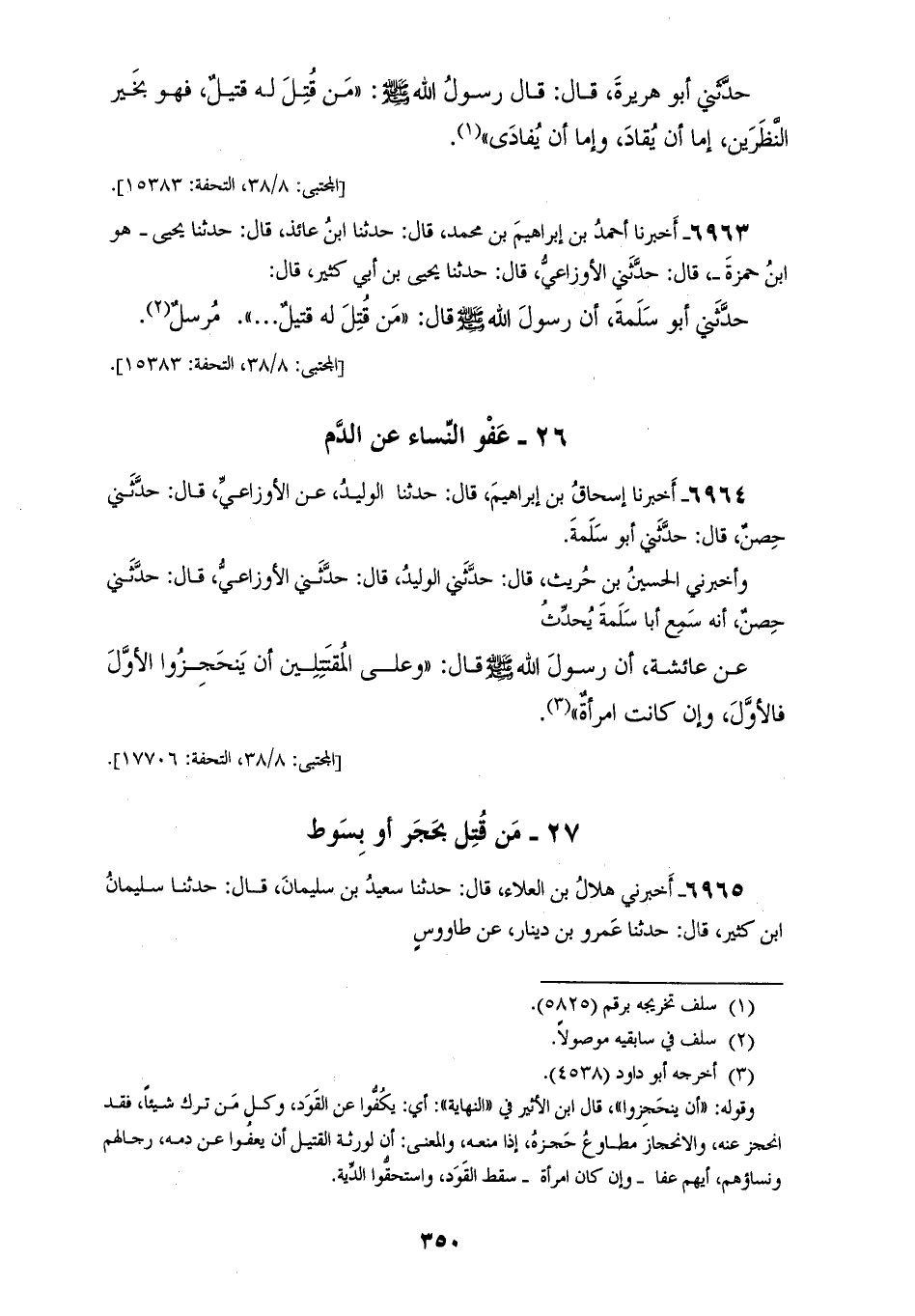 6962 - أَخْبَرَنَا الْعَبَّاسُ بْنُ الْوَلِيدِ بْنِ مَزْيَدٍ، قَالَ: أَخْبَرَنِي أَبِي، قَالَ: حَدَّثَنَا الْأَوْزَاعِيُّ، قَالَ: حَدَّثَنِي يَحْيَى، قَالَ: حَدَّثَنِي أَبُو سَلَمَةَ، قَالَ: حَدَّثَنِي أَبُو هُرَيْرَةَ، قَالَ: قَالَ رَسُولُ اللهِ صَلَّى اللهُ عَلَيْهِ وَسَلَّمَ: «§مَنْ قُتِلَ لَهُ قَتِيلٌ فَهُوَ بِخَيْرِ النَّظَرَيْنِ، إِمَّا أَنْ يُقَادَ، وَإِمَّا أَنْ يُفَادَى»