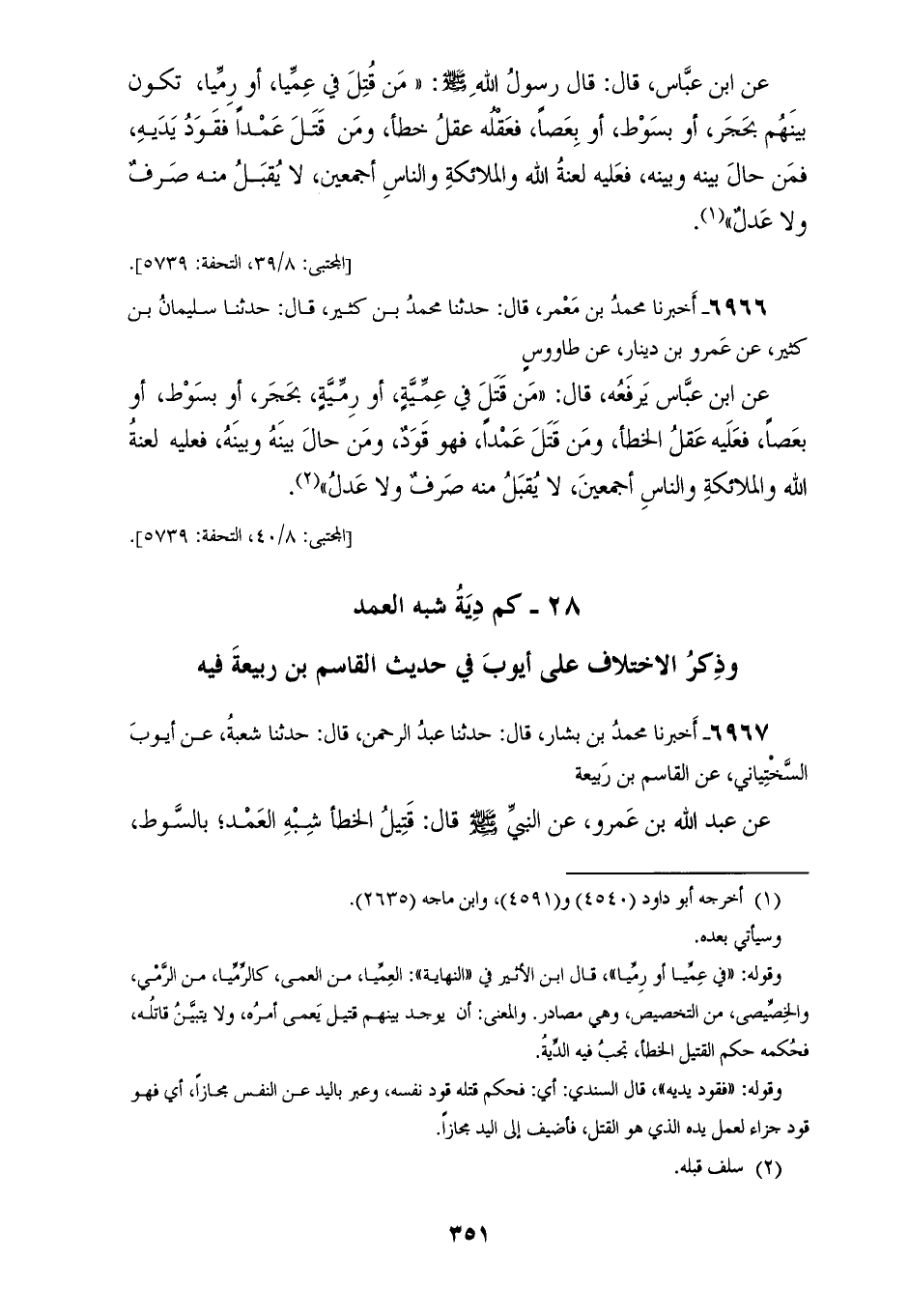 6966 - أَخْبَرَنَا مُحَمَّدُ بْنُ مَعْمَرٍ، قَالَ: حَدَّثَنَا مُحَمَّدُ بْنُ كَثِيرٍ، قَالَ: حَدَّثَنَا سُلَيْمَانُ بْنُ كَثِيرٍ، عَنْ عَمْرِو بْنِ دِينَارٍ، عَنْ طَاوُسٍ، عَنِ ابْنِ عَبَّاسٍ يَرْفَعُهُ، قَالَ: «§مَنْ قُتِلَ فِي عِمِّيَّةٍ، أَوْ رِمِّيَّةٍ بِحَجَرٍ، أَوْ بِسَوْطٍ، أَوْ بِعَصًا فَعَلَيْهِ عَقْلُ الْخَطَأِ، وَمَنْ قُتِلَ عَمْدًا فَهُوَ قَوَدٌ، وَمَنْ حَالَ بَيْنَهُ وَبَيْنَهُ فَعَلَيْهِ لَعْنَةٌ اللهِ، وَالْمَلَائِكَةِ، وَالنَّاسِ أَجْمَعِينَ، لَا يُقْبَلُ مِنْهُ صَرْفٌ، وَلَا عَدْلٌ»