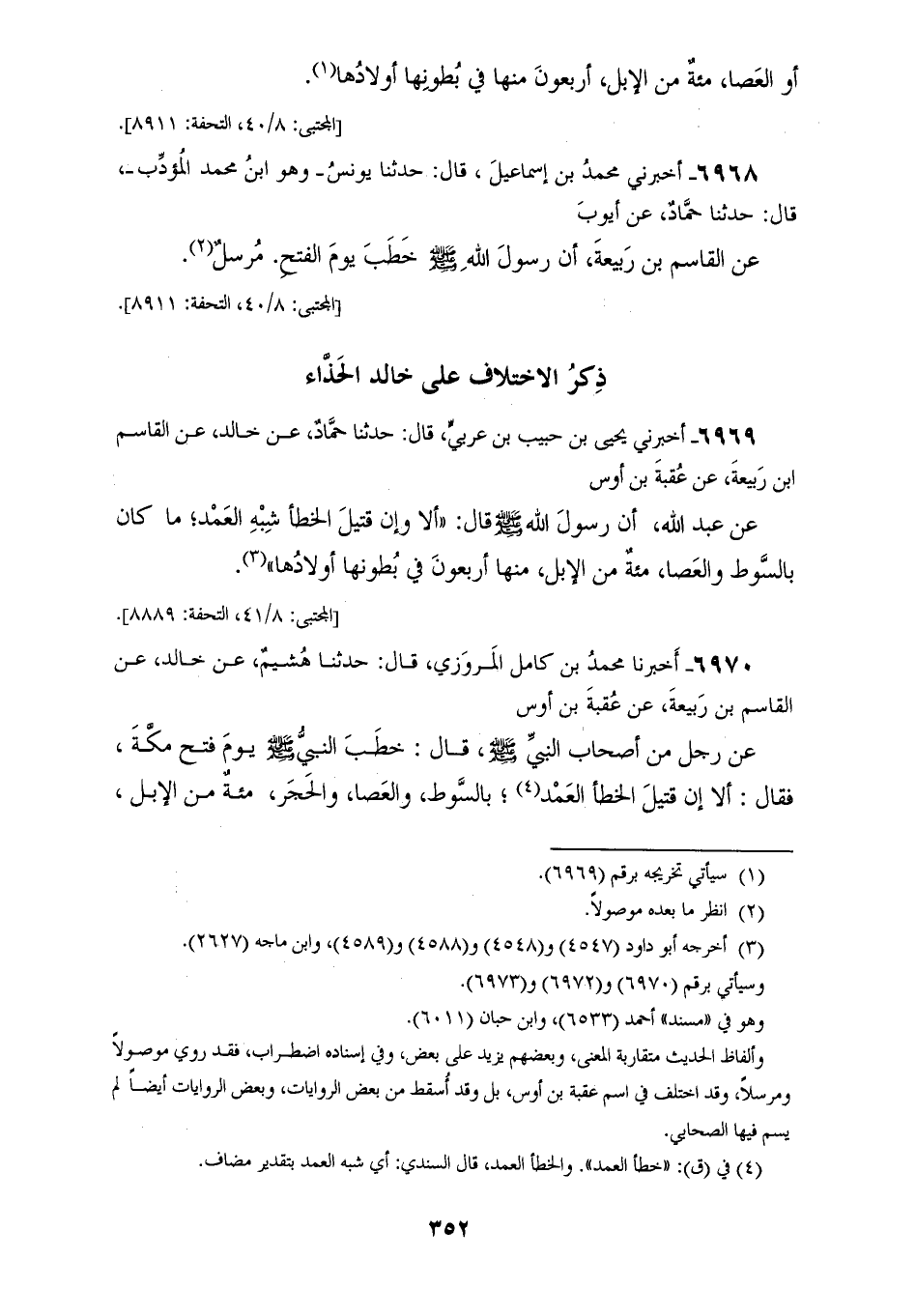6969 - أَخْبَرَنِي يَحْيَى بْنُ حَبِيبِ بْنِ عَرَبِيٍّ، قَالَ: حَدَّثَنَا حَمَّادٌ، عَنْ خَالِدٍ، عَنِ الْقَاسِمِ بْنِ رَبِيعَةَ، عَنْ عُقْبَةَ بْنِ أَوْسٍ، عَنْ عَبْدِ اللهِ، أَنَّ رَسُولَ اللهِ صَلَّى اللهُ عَلَيْهِ وَسَلَّمَ قَالَ: «§أَلَا وَإِنَّ قَتِيلَ الْخَطَأِ شِبْهِ الْعَمْدِ مَا كَانَ بِالسَّوْطِ، وَالْعَصَا مِائَةٌ مِنَ الْإِبِلِ، مِنْهَا أَرْبَعُونَ فِي بُطُونِهَا أَوْلَادُهَا»