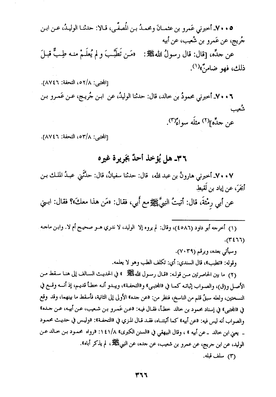 7005 - أَخْبَرَنِي عَمْرُو بْنُ عُثْمَانَ، وَمُحَمَّدُ بْنُ الْمُصَفَّى، قَالَا: حَدَّثَنَا الْوَلِيدُ، عَنِ ابْنِ جُرَيْجٍ، عَنْ عَمْرِو بْنِ شُعَيْبٍ، عَنْ أَبِيهِ، عَنْ جَدِّهِ قَالَ: قَالَ رَسُولُ اللهِ صَلَّى اللهُ عَلَيْهِ وَسَلَّمَ: «§مَنْ تَطَبَّبَ، وَلَمْ يُعْلَمْ مِنْهُ طِبٌّ قَبْلَ ذَلِكَ، فَهُوَ ضَامِنٌ»