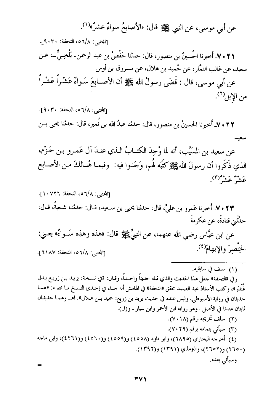 7022 - أَخْبَرَنَا الْحُسَيْنُ بْنُ مَنْصُورٍ، قَالَ: حَدَّثَنَا عَبْدُ اللهِ بْنُ نُمَيْرٍ، قَالَ: حَدَّثَنَا يَحْيَى بْنُ سَعِيدٍ، عَنْ سَعِيدِ بْنِ الْمُسَيِّبِ، أَنَّهُ لَمَّا وَجَدَ الْكِتَابَ الَّذِي عِنْدَ آلِ عَمْرِو بْنِ حَزْمٍ، الَّذِي ذَكَرُوا أَنَّ رَسُولَ اللهِ صَلَّى اللهُ عَلَيْهِ وَسَلَّمَ: «§كَتَبَهُ لَهُمْ وَجَدُوا فِيهِ وَفِيمَا هُنَالِكَ مِنَ الْأَصَابِعِ عَشْرٌ عَشْرٌ»