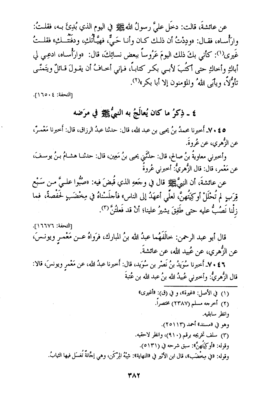 7045 - أَخْبَرَنَا مُحَمَّدُ بْنُ يَحْيَى بْنِ عَبْدِ اللهِ، قَالَ: حَدَّثَنَا عَبْدُ الرَّزَّاقِ، قَالَ: أَخْبَرَنَا مَعْمَرٌ، عَنِ الزُّهْرِيِّ، عَنْ عُرْوَةَ، وَأَخْبَرَنِي مُعَاوِيَةُ بْنُ صَالِحٍ، قَالَ: حَدَّثَنِي يَحْيَى بْنُ مَعِينٍ، قَالَ: حَدَّثَنَا هِشَامُ بْنُ يُوسُفَ، عَنْ مَعْمَرٍ، قَالَ: قَالَ الزُّهْرِيُّ: أَخْبَرَنِي عُرْوَةُ، عَنْ عَائِشَةَ، أَنَّ النَّبِيَّ صَلَّى اللهُ عَلَيْهِ وَسَلَّمَ، قَالَ فِي وَجَعِهِ الَّذِي قُبِضَ فِيهِ: «§صُبُّوا عَلَيَّ مِنْ سَبْعِ قِرَبٍ لَمْ تُحْلَلْ أَوْكِيَتُهُنَّ لَعَلِّي أَعْهَدُ إِلَى النَّاسِ» فَأَجْلَسْنَاهُ فِي مِخْضَبٍ، لِحَفْصَةَ، فَمَا زِلْنَا نَصُبُّ عَلَيْهِ حَتَّى طَفِقَ يُشِيرُعَلَيْنَا " أَنْ قَدْ فَعَلْتُنَّ قَالَ أَبُو عَبْدِ الرَّحْمَنِ: خَالَفَهُمَا عَبْدُ اللهِ بْنُ الْمُبَارَكِ، فَرَوَاهُ عَنْ مَعْمَرٍ، وَيُونُسَ، عَنِ الزُّهْرِيِّ، عَنْ عُبَيْدِ اللهِ، عَنْ عَائِشَةَ