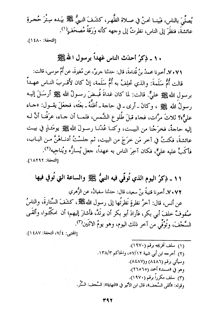 7072 - أَخْبَرَنَا قُتَيْبَةُ بْنُ سَعِيدٍ، قَالَ: حَدَّثَنَا سُفْيَانُ، عَنِ الزُّهْرِيِّ، عَنْ أَنَسٍ، قَالَ: آخِرُ نَظْرَةٍ نَظَرْتُهَا إِلَى رَسُولِ اللهِ صَلَّى اللهُ عَلَيْهِ وَسَلَّمَ، كَشَفَ السِّتَارَةَ وَالنَّاسُ صُفُوفٌ خَلْفَ أَبِي بَكْرٍ، فَأَرَادَ أَبُو بَكْرٍ أَنْ يَرْتَدَّ فَأَشَارَ إِلَيْهِمْ أَنِ §امْكُثُوا، وَأَلْقَى السِّجْفَ وَتُوُفِّيَ مِنْ آخِرِ ذَلِكَ الْيَوْمِ وَهُوَ يَوْمُ الِاثْنَيْنِ "