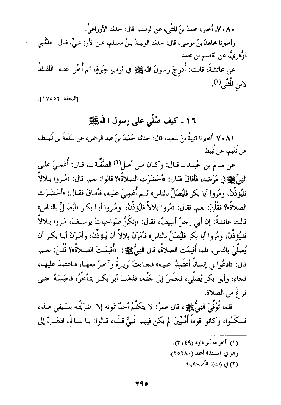 7080 - أَخْبَرَنَا مُحَمَّدُ بْنُ الْمُثَنَّى، عَنِ الْوَلِيدِ، قَالَ: حَدَّثَنَا الْأَوْزَاعِيُّ، وأَخْبَرَنَا مُجَاهِدُ بْنُ مُوسَى، قَالَ: حَدَّثَنَا الْوَلِيدُ بْنُ مُسْلِمٍ، عَنِ الْأَوْزَاعِيِّ، قَالَ: حَدَّثَنِي الزُّهْرِيُّ، عَنِ الْقَاسِمِ بْنِ مُحَمَّدٍ، عَنْ عَائِشَةَ، قَالَتْ: «§ادْرِجَ رَسُولُ اللهِ صَلَّى اللهُ عَلَيْهِ وَسَلَّمَ فِي ثَوْبٍ حِبَرَةٍ، ثُمَّ اخِّرَ عَنْهُ» اللَّفْظُ لِابْنِ الْمُثَنَّى