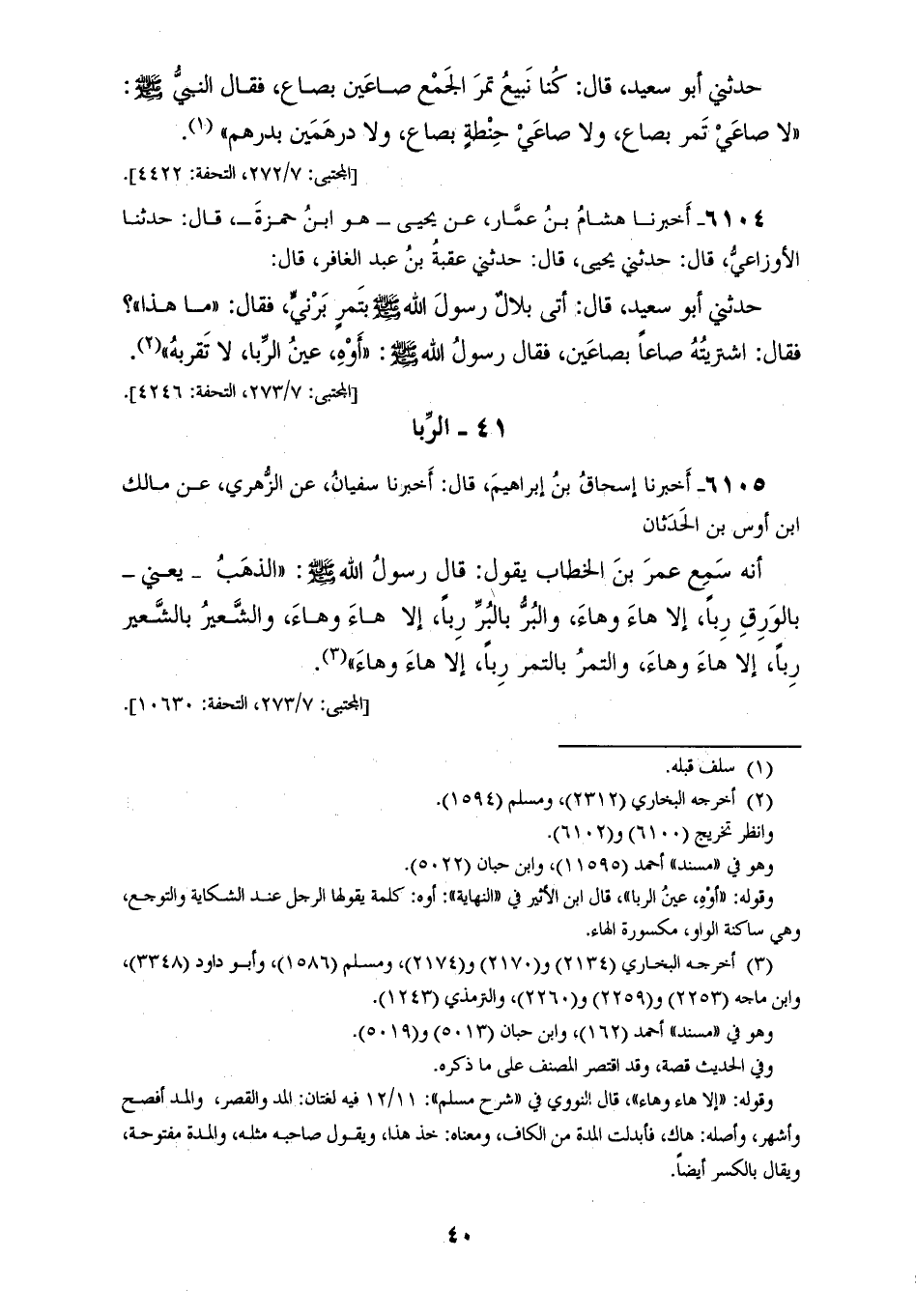 6105 - أَخْبَرَنَا إِسْحَاقُ بْنُ إِبْرَاهِيمَ، قَالَ: أَخْبَرَنَا سُفْيَانُ، عَنِ الزُّهْرِيِّ، عَنْ مَالِكِ بْنِ أَوْسِ بْنِ الْحَدَثَانِ، أَنَّهُ سَمِعَ عُمَرَ بْنَ الْخَطَّابِ، يَقُولُ: قَالَ رَسُولُ اللهِ صَلَّى اللهُ عَلَيْهِ وَسَلَّمَ: «§الذَّهَبُ، يَعْنِي بِالْوَرِقِ، رِبًا إِلَّا هَاءَ وَهَاءَ، وَالْبُرُّ بِالْبُرِّ رَبًّا إِلَّا هَاءَ وَهَاءَ، وَالشَّعِيرُ بِالشَّعِيرِ رَبًّا إِلَّا هَاءَ وَهَاءَ، وَالتَّمْرُ بِالتَّمْرِ رَبًّا إِلَّا هَاءَ وَهَاءَ»