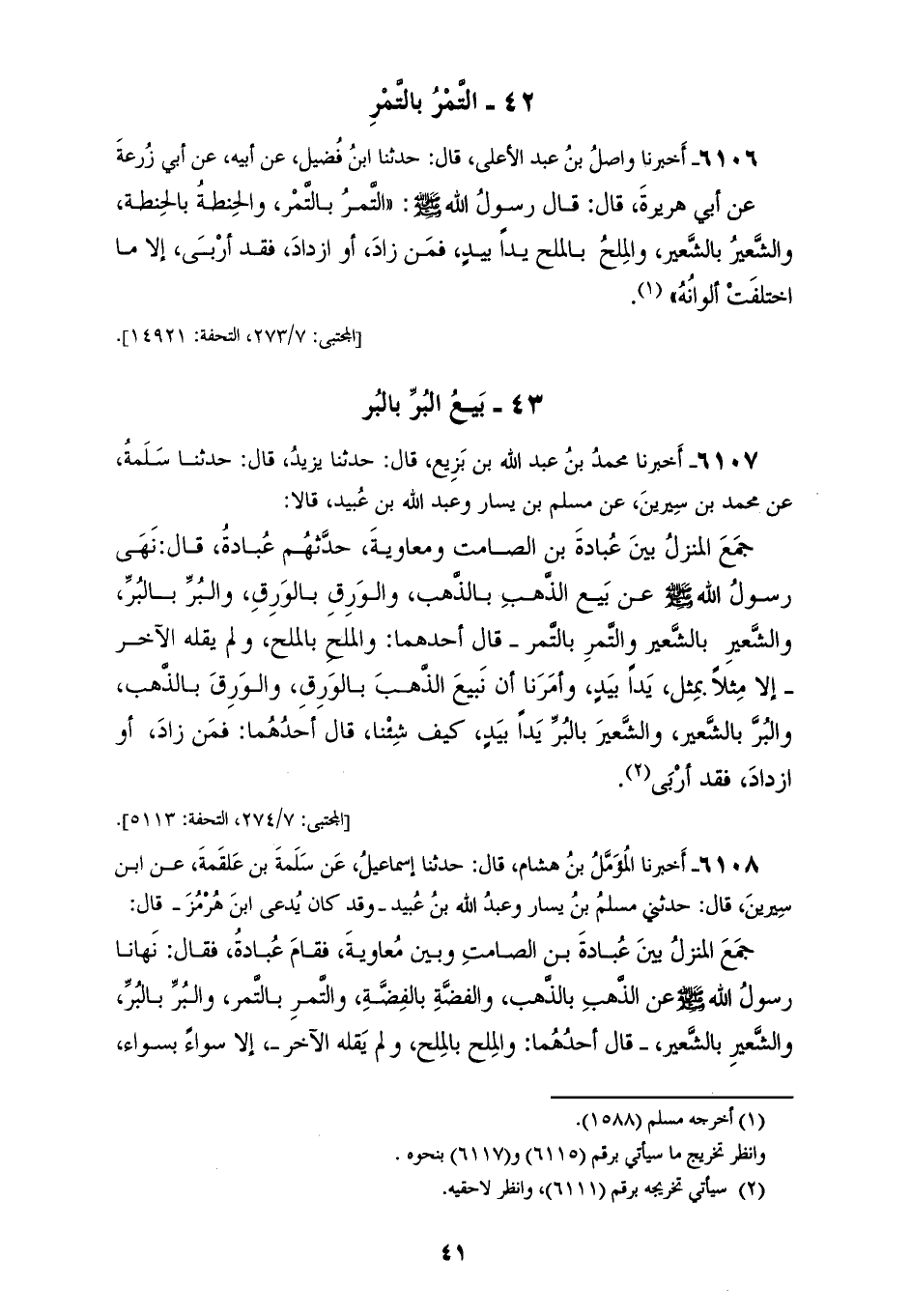 6106 - أَخْبَرَنَا وَاصِلُ بْنُ عَبْدِ الْأَعْلَى، قَالَ: حَدَّثَنَا ابْنُ فُضَيْلٍ، عَنْ أَبِيهِ، عَنْ أَبِي زُرْعَةَ، عَنْ أَبِي هُرَيْرَةَ، قَالَ: قَالَ رَسُولُ اللهِ صَلَّى اللهُ عَلَيْهِ وَسَلَّمَ: «§التَّمْرُ بِالتَّمْرِ، وَالْحِنْطَةُ بِالْحِنْطَةِ، وَالشَّعِيرُ بِالشَّعِيرِ، وَالْمِلْحُ بِالْمِلْحِ يَدًا بَيْدٍ، فَمَنْ زَادَ أَوِ ازْدَادَ فَقَدْ أَرْبَى إِلَّا مَا اخْتَلَفَتْ أَلْوَانُهُ»