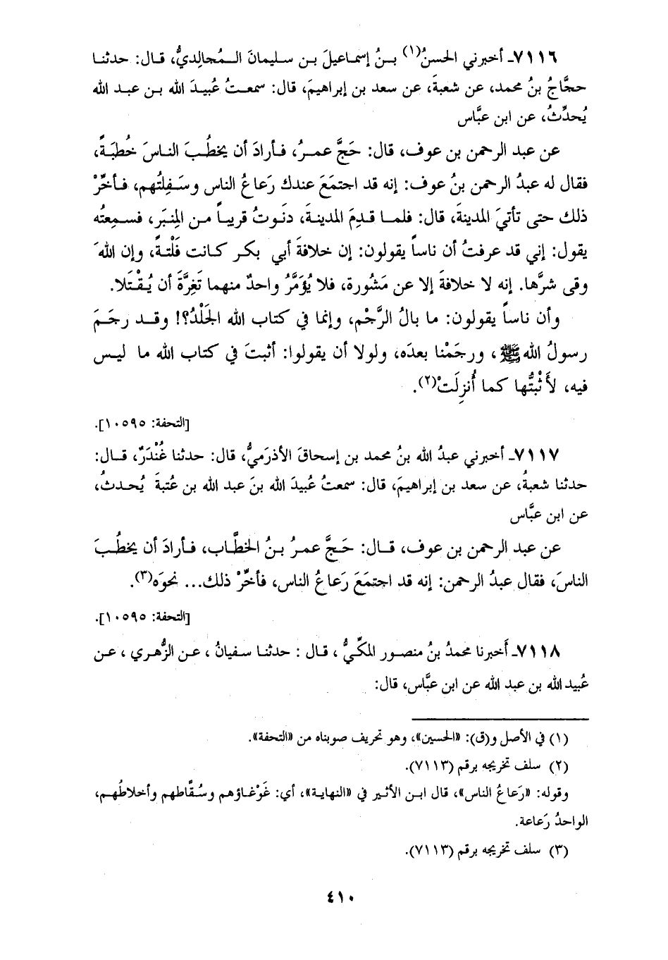 7116 - أَخْبَرَنِي الْحَسَنُ بْنُ إِسْمَاعِيلَ بْنِ سُلَيْمَانَ الْمُجَالِدِيُّ، قَالَ: حَدَّثَنَا حَجَّاجُ بْنُ مُحَمَّدٍ، عَنْ شُعْبَةَ، عَنْ سَعْدِ بْنِ إِبْرَاهِيمَ، قَالَ: سَمِعْتُ عُبَيْدَ اللهِ بْنَ عَبْدِ اللهِ يُحَدِّثُ، عَنِ ابْنِ عَبَّاسٍ، عَنْ عَبْدِ الرَّحْمَنِ بْنِ عَوْفٍ، قَالَ: حَجَّ عُمَرُ فَأَرَادَ أَنْ يَخْطُبَ النَّاسَ خُطْبَةً فَقَالَ لَهُ عَبْدُ الرَّحْمَنِ بْنُ عَوْفٍ: أَنَّهُ قَدِ اجْتَمَعَ عِنْدَكَ رَعَاعُ النَّاسِ وَسِفْلَتُهُمْ فَأَخِّرْ ذَلِكَ حَتَّى تَأْتِيَ الْمَدِينَةَ قَالَ: فَلَمَّا قَدِمَ الْمَدِينَةَ دَنَوْتُ قَرِيبًا مِنَ الْمِنْبَرِ، فَسَمِعْتُهُ يَقُولُ: إِنِّي قَدْ عَرَفْتُ أَنَّ نَاسًا يَقُولُونَ: إِنَّ خِلَافَةَ أَبِي بَكْرٍ، كَانَتْ فَلْتَةً، وَإِنَّ اللهَ وَقَى شَرَّهَا إِنَّهُ لَا خِلَافَةَ إِلَّا عَنْ مَشُورَةٍ، فَلَا يُؤَمَّرُ وَاحِدٌ مِنْهُمَا تَغِرَّةَ أَنْ يُقْتَلَا وَأَنَّ نَاسًا يَقُولُونَ: مَا بَالُ الرَّجْمِ وَإِنَّمَا فِي كِتَابِ اللهِ الْجَلْدُ؟ وَقَدْ رَجَمَ رَسُولُ اللهِ صَلَّى اللهُ عَلَيْهِ وَسَلَّمَ وَرَجَمْنَا بَعْدَهُ وَلَوْلَا أَنْ يَقُولُوا: «§أَثْبَتَ فِي كِتَابِ اللهِ مَا لَيْسَ فِيهِ لَأَثْبَتُّهَا كَمَا أُنْزِلَتْ»