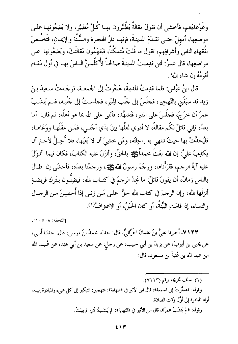 7122 - أَخْبَرَنَا يُوسُفُ بْنُ سَعِيدِ بْنِ مُسْلِمٍ الْمِصِّيصِيُّ، قَالَ: حَدَّثَنَا حَجَّاجُ بْنُ مُحَمَّدٍ، قَالَ: حَدَّثَنَا لَيْثُ بْنُ سَعْدٍ، عَنْ عَقِيلٍ، عَنِ ابْنِ شِهَابٍ، عَنْ عُبَيْدِ اللهِ بْنِ عَبْدِ اللهِ، أَنَّ ابْنَ عَبَّاسٍ، أَخْبَرَهُ أَنَّهُ كَانَ يُقْرِئُ عَبْدَ الرَّحْمَنِ بْنَ عَوْفٍ، وَأَنَّ عَبْدَ الرَّحْمَنِ بْنَ عَوْفٍ رَجَعَ إِلَيْهِ يَوْمًا مِنْ عِنْدِ عُمَرَ، فِي آخِرِ حَجَّةٍ حَجَّهَا عُمَرُ وَهُوَ بِمِنًى، قَالَ عَبْدُ الرَّحْمَنِ بْنُ عَوْفٍ لِعَبْدِ اللهِ بْنِ عَبَّاسٍ: لَوْ رَأَيْتَ رَجُلًا أَتَى عُمَرَ، آنِفًا فَأَخْبَرَهُ أَنَّ رَجُلًا قَالَ: وَاللهِ لَوْ مَاتَ عُمَرُ لَقَدْ بَايَعْتُ فُلَانًا قَالَ عُمَرُ: إِنِّي قَائِمٌ الْعَشِيَّةَ إِنْ شَاءَ اللهُ فَمُحَذِّرُهُمْ هَؤُلَاءِ النَّفَرَ الَّذِينَ يَغْصِبُونَهُمْ أَمْرَهُمْ قَالَ عَبْدُ الرَّحْمَنِ، فَقُلْتُ: يَا أَمِيرَ الْمُؤْمِنِينَ، لَا تَفْعَلْ ذَلِكَ يَوْمَكَ هَذَا فَإِنَّ الْمَوْسِمَ يَجْمَعُ رَعَاعَ النَّاسِ وَغَوْغَاءَهُمْ، فَأَخْشَى أَنْ تَقُولَ مَقَالَةً يُطَّيَّرُونَ بِهَا كُلَّ مُطِّيَّرٍ، وَلَا يَضَعُونَهَا عَلَى مَوْضِعَهَا أَمْهِلْ حَتَّى تَقْدِمَ الْمَدِينَةَ فَإِنَّهَا دَارُ الْهِجْرَةِ وَالسُّنَّةِ وَالْإِيمَانِ فَتَخْلُصُ بِفُقَهَاءِ النَّاسِ وَأَشْرَافِهِمْ، تَقُولُ مَا قُلْتَ مُتَمَكِّنًا فَيَفْهَمُونَ مَقَالَتَكَ وَيَضَعُونَهَا عَلَى مَوَاضِعِهَا قَالَ عُمَرُ: لَئِنْ قَدِمَتُ الْمَدِينَةَ صَالِحًا لَأُكَلِّمَنَّ النَّاسَ بِهَا فِي أَوَّلِ مَقَامٍ أَقُومُهُ إِنْ شَاءَ اللهُ قَالَ ابْنُ عَبَّاسٍ: " فَلَمَّا قَدِمَتُ الْمَدِينَةَ هَجَّرْتُ إِلَى الْجُمُعَةِ فَوَجَدْتُ سَعِيدَ بْنَ زَيْدٍ، قَدْ سَبَقَنِي بِالتَّهْجِيرِ فَجَلَسَ إِلَى جَنْبِ الْمِنْبَرِ فَجَلَسْتُ إِلَى جَنْبِهِ فَلَمْ يَنْشَبْ عُمَرُ أَنْ خَرَجَ فَجَلَسَ عَلَى الْمِنْبَرِ فَتَشَهَّدَ فَأَثْنَى عَلَى اللهِ بِمَا هُوَ أَهْلُهُ ثُمَّ قَالَ: أَمَّا بَعْدُ فَإِنِّي قَائِلٌ لَكُمْ مَقَالَةً لَا أَدْرِي لَعَلَّهَا بَيْنَ يَدَيْ أَجَلِي فَمَنْ عَقِلَهَا وَوَعَاهَا فَلْيُحَدِّثْ بِهَا حَيْثُ تَنْتَهِي بِهِ رَاحِلَتُهُ، وَمَنْ خَشِيَ أَنْ لَا يُعِيَهَا §فَلَا أُحِلُّ لِأَحَدٍ أَنْ يَكْذِبَ عَلَيَّ إِنَّ اللهَ بَعَثَ مُحَمَّدًا صَلَّى اللهُ عَلَيْهِ وَسَلَّمَ، بِالْحَقِّ وَأَنْزَلَ عَلَيْهِ الْكِتَابَ فَكَانَ فِيمَا أَنْزَلَ عَلَيْهِ آيَةُ الرَّجْمِ فَقَرَأْنَاهَا، وَرَجَمَ رَسُولُ اللهِ صَلَّى اللهُ عَلَيْهِ وَسَلَّمَ، وَرَجَمْنَا بَعْدَهُ فَأَخْشَى إِنْ طَالَ بِالنَّاسِ زَمَانٌ أَنْ يَقُولَ قَائِلٌ: مَا نَجِدُ الرَّجْمَ فِي كِتَابِ اللهِ فَيَضِلُّونَ بِتَرْكِ فَرِيضَةٍ أَنْزَلَهَا اللهُ، وَإِنَّ الرَّجْمَ فِي كِتَابِ اللهِ حَقٌّ عَلَى مَنْ زَنَا إِذَا أُحْصِنَ مِنَ الرِّجَالِ وَالنِّسَاءِ، إِذَا قَامَتِ الْبَيِّنَةُ أَوْ كَانَ الْحَبَلُ أَوِ الِاعْتِرَافُ "