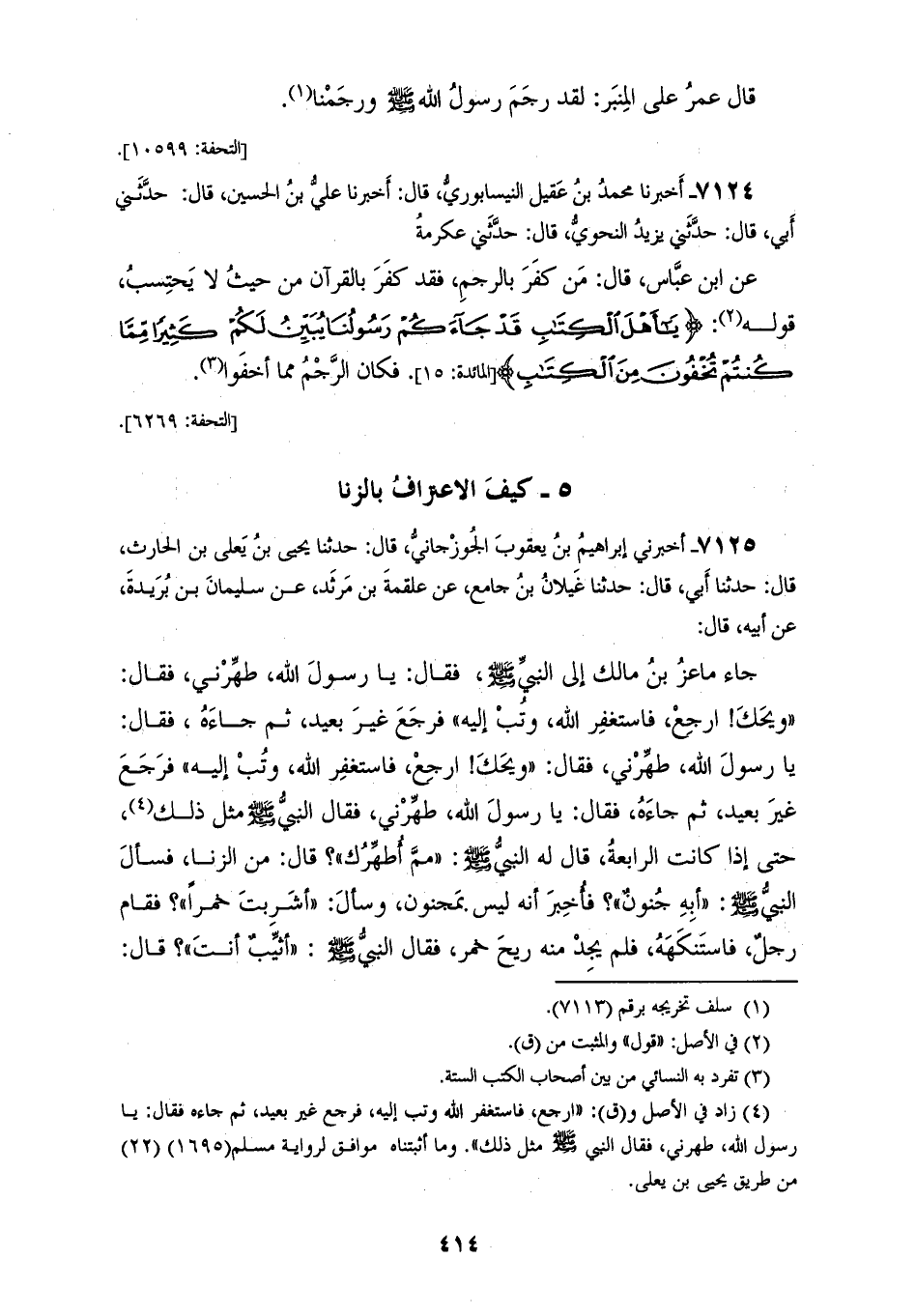 7124 - أَخْبَرَنَا مُحَمَّدُ بْنُ عَقِيلٍ النَّيْسَابُورِيُّ، قَالَ: أَخْبَرَنَا عَلِيُّ بْنُ الْحُسَيْنِ، قَالَ: حَدَّثَنِي أَبِي، قَالَ: حَدَّثَنِي يَزِيدُ النَّحْوِيُّ، قَالَ: حَدَّثَنِي عِكْرِمَةُ، عَنِ ابْنِ عَبَّاسٍ، قَالَ: «§مَنْ كَفَرَ بِالرَّجْمِ فَقَدْ كَفَرَ بِالْقُرْآنِ مِنْ حَيْثُ لَا يَحْتَسِبُ» قَوْلُ: {يَا أَهْلَ الْكِتَابِ قَدْ جَاءَكُمْ رَسُولُنَا يُبَيِّنُ لَكُمْ كَثِيرًا مِمَّا كُنْتُمْ تُخْفُونَ مِنَ الْكِتَابِ} [المائدة: 15] فَكَانَ الرَّجْمُ مِمَّا أَخْفُوا