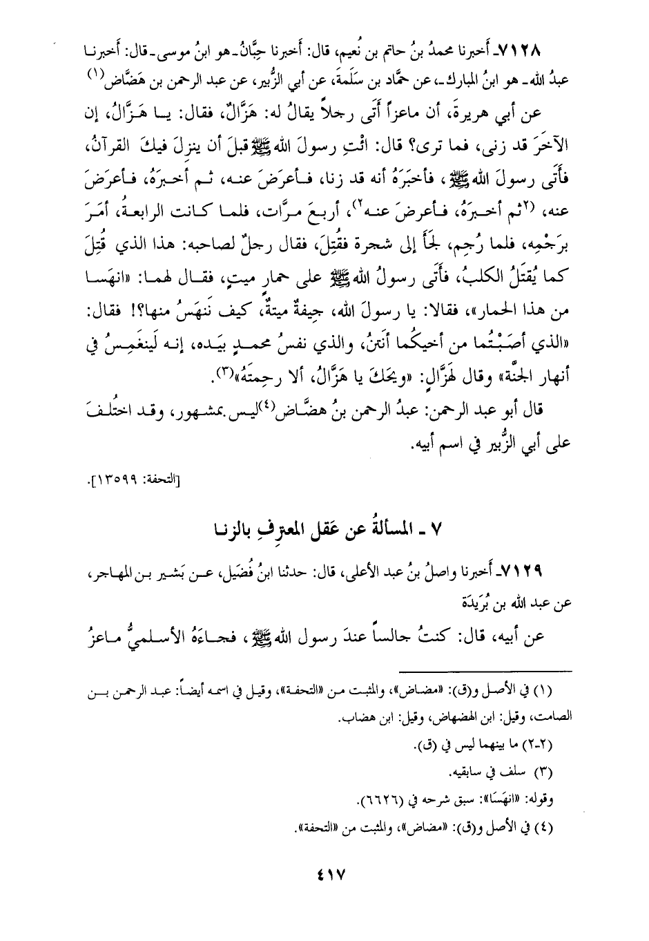 7128 - أَخْبَرَنَا مُحَمَّدُ بْنُ حَاتِمِ بْنِ نُعَيْمٍ، قَالَ: أَخْبَرَنَا حَبَّانُ هُوَ ابْنُ مُوسَى، قَالَ: أَخْبَرَنَا عَبْدُ اللهِ هُوَ ابْنُ الْمُبَارَكِ، عَنْ حَمَّادِ بْنِ سَلَمَةَ، عَنْ أَبِي الزُّبَيْرِ، عَنْ عَبْدِ الرَّحْمَنِ بْنِ هِضَاضٍ، عَنْ أَبِي هُرَيْرَةَ، أَنَّ مَاعِزًا، أَتَى رَجُلًا يُقَالُ لَهُ هَزَّالُ فَقَالَ: يَا هَزَّالُ، إِنَّ الْآخَرَ قَدْ زَنَا فَمَا تَرَى؟ قَالَ: ائْتِ رَسُولَ اللهِ صَلَّى اللهُ عَلَيْهِ وَسَلَّمَ، قَبْلَ أَنْ يَنْزِلَ فِيكَ الْقُرْآنُ، فَأَتَى رَسُولَ اللهِ صَلَّى اللهُ عَلَيْهِ وَسَلَّمَ فَأَخْبَرَهُ أَنَّهُ قَدْ زَنَا فَأَعْرَضَ عَنْهُ، ثُمَّ أَخْبَرَهُ فَأَعْرَضَ عَنْهُ، ثُمَّ أَخْبَرَهُ فَأَعْرَضَ عَنْهُ أَرْبَعَ مَرَّاتٍ فَلَمَّا كَانَتِ الرَّابِعَةُ أَمَرَ بِرَجْمِهِ فَلَمَّا رُجِمَ لَجَأَ إِلَى شَجَرَةٍ فَقُتِلَ فَقَالَ رَجُلٌ لِصَاحِبِهِ: هَذَا الَّذِي قُتِلَ كَمَا يُقْتَلُ الْكَلْبُ فَأَتَى رَسُولُ اللهِ صَلَّى اللهُ عَلَيْهِ وَسَلَّمَ عَلَى حِمَارٍ مَيِّتٍ فَقَالَ لَهُمَا: «انْهَسَا مِنْ هَذَا الْحِمَارِ» فَقَالَا: يَا رَسُولَ اللهِ، جِيفَةٌ مَيِّتَةٌ كَيْفَ نَنْهَسُ مِنْهَا؟ فَقَالَ: «§الَّذِي أَصَبْتُمَا مِنْ أَخِيكُمَا أَنْتَنُ وَالَّذِي نَفْسُ مُحَمَّدٍ بِيَدِهِ إِنَّهُ لَيَنْغَمِسُ فِي أَنْهَارِ الْجَنَّةِ» وَقَالَ لِهَزَّالٍ: وَيْحَكَ يَا هَزَّالُ، أَلَا رَحْمَتَهُ " قَالَ: أَبُو عَبْدِ الرَّحْمَنِ عَبْدُ الرَّحْمَنِ بْنُ هِضَاضٍ لَيْسَ بِمَشْهُورٍ وَقَدِ اخْتُلِفَ عَلَى أَبِي الزُّبَيْرِ، فِي اسْمِ أَبِيهِ