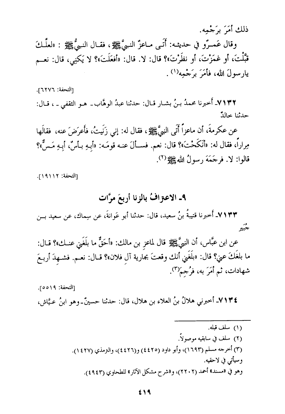 7132 - أَخْبَرَنَا مُحَمَّدُ بْنُ بَشَّارٍ، قَالَ: حَدَّثَنَا عَبْدُ الْوَهَّابِ هُوَ الثَّقَفِيُّ، قَالَ: حَدَّثَنَا خَالِدٌ، عَنْ عِكْرِمَةَ، أَنَّ مَاعِزًا أَتَى النَّبِيَّ صَلَّى اللهُ عَلَيْهِ وَسَلَّمَ فَقَالَ لَهُ: إِنِّي زَنَيْتُ فَأَعْرَضَ عَنْهُ فَقَالَهَا: مِرَارًا فَقَالَ لَهُ: «أَنَكَحْتَ؟» قَالَ: نَعَمْ، فَسَأَلَ عَنْهُ قَوْمَهُ «أَبِهِ بَأْسٌ؟ أَبِهِ مَسٌّ؟» قَالُوا: لَا، §فَرَجَمَهُ رَسُولُ اللهِ صَلَّى اللهُ عَلَيْهِ وَسَلَّمَ