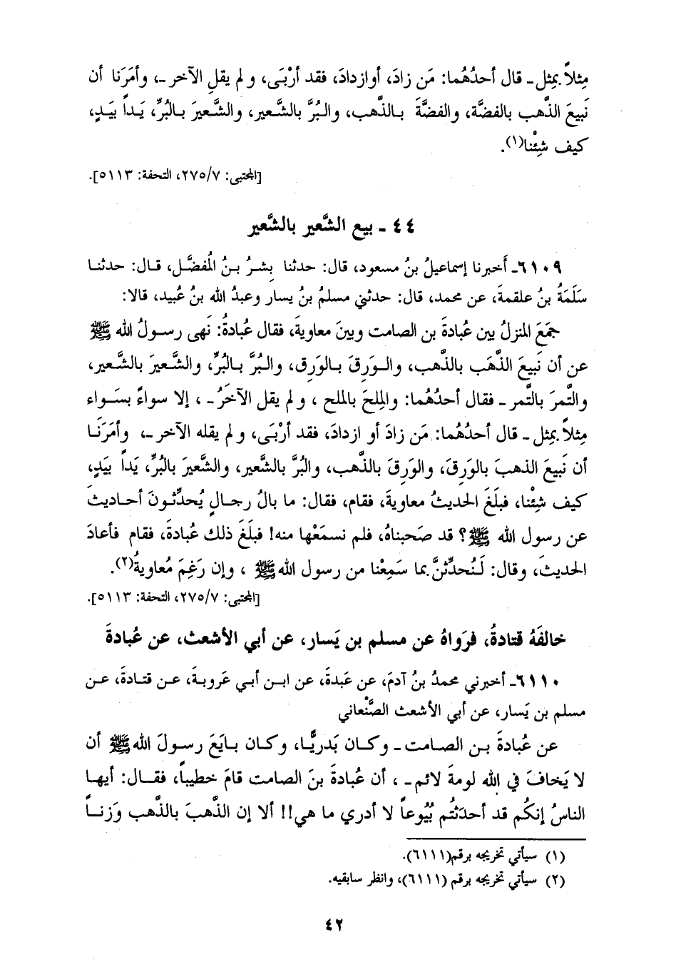 6109 - أَخْبَرَنَا إِسْمَاعِيلُ بْنُ مَسْعُودٍ، قَالَ: حَدَّثَنَا بِشْرُ بْنُ الْمُفَضَّلِ، قَالَ: حَدَّثَنَا سَلَمَةُ بْنُ عَلْقَمَةَ، عَنْ مُحَمَّدٍ، قَالَ: حَدَّثَنِي مُسْلِمُ بْنُ يَسَارٍ، وَعَبْدُ اللهِ بْنُ عُبَيْدٍ قَالَا: جَمَعَ الْمَنْزِلُ بَيْنَ عُبَادَةَ بْنِ الصَّامِتِ وَبَيْنَ مُعَاوِيَةَ، فَقَالَ عُبَادَةُ: نَهَى رَسُولُ اللهِ صَلَّى اللهُ عَلَيْهِ وَسَلَّمَ عَنْ أَنْ §نَبِيعَ الذَّهَبَ بِالذَّهَبِ، وَالْوَرِقَ بِالْوَرِقِ، وَالْبُرَّ بِالْبُرِّ، وَالشَّعِيرَ بِالشَّعِيرِ، وَالتَّمْرَ بِالتَّمْرِ. فَقَالَ أَحَدُهُمَا: وَالْمِلْحَ بِالْمِلْحِ، وَلَمْ يَقُلِ الْآخَرُ، إِلَّا سَوَاءً بِسَوَاءٍ، مِثْلًا بِمِثْلٍ، قَالَ أَحَدُهُمَا: مَنْ زَادَ أَوِ ازْدَادَ، فَقَدْ أَرْبَى، وَلَمْ يَقُلْهُ الْآخَرُ، وَأَمَرَنَا أَنْ نَبِيعَ الذَّهَبَ بِالْوَرِقِ، وَالْوَرِقَ بِالذَّهَبِ، وَالْبُرَّ بِالشَّعِيرِ، وَالشَّعِيرَ بِالْبُرِّ يَدًا بِيَدٍ، كَيْفَ شِئْنَا، فَبَلَغَ الْحَدِيثُ مُعَاوِيَةَ، فَقَامَ فَقَالَ: مَا بَالُ رِجَالٍ يُحَدِّثُونَ أَحَادِيثَ عَنْ رَسُولِ اللهِ صَلَّى اللهُ عَلَيْهِ وَسَلَّمَ، قَدْ صَحِبْنَاهُ، فَلَمْ نَسْمَعْهَا مِنْهُ، فَبَلَغَ ذَلِكَ عُبَادَةَ، فَقَامَ فَأَعَادَ الْحَدِيثَ، وَقَالَ: لَنُحَدِّثَنَّ بِمَا سَمِعْنَا مِنْ رَسُولِ اللهِ صَلَّى اللهُ عَلَيْهِ وَسَلَّمَ، وَإِنْ رُغِمَ مُعَاوِيَةُ. خَالَفَهُ قَتَادَةُ فَرَوَاهُ عَنْ مُسْلِمِ بْنِ يَسَارٍ، عَنْ أَبِي الْأَشْعَثِ، عَنْ عُبَادَةَ