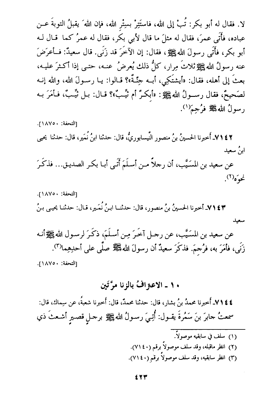 7142 - أَخْبَرَنَا الْحُسَيْنُ بْنُ مَنْصُورٍ النَّيْسَابُورِيُّ، قَالَ: حَدَّثَنَا ابْنُ نُمَيْرٍ، قَالَ: حَدَّثَنَا يَحْيَى بْنُ سَعِيدٍ، عَنْ سَعِيدِ بْنِ الْمُسَيِّبِ، أَنَّ رَجُلًا مِنْ أَسْلَمَ أَتَى أَبَا بَكْرٍ الصِّدِّيقَ، فَذَكَرَ نَحْوَهُ