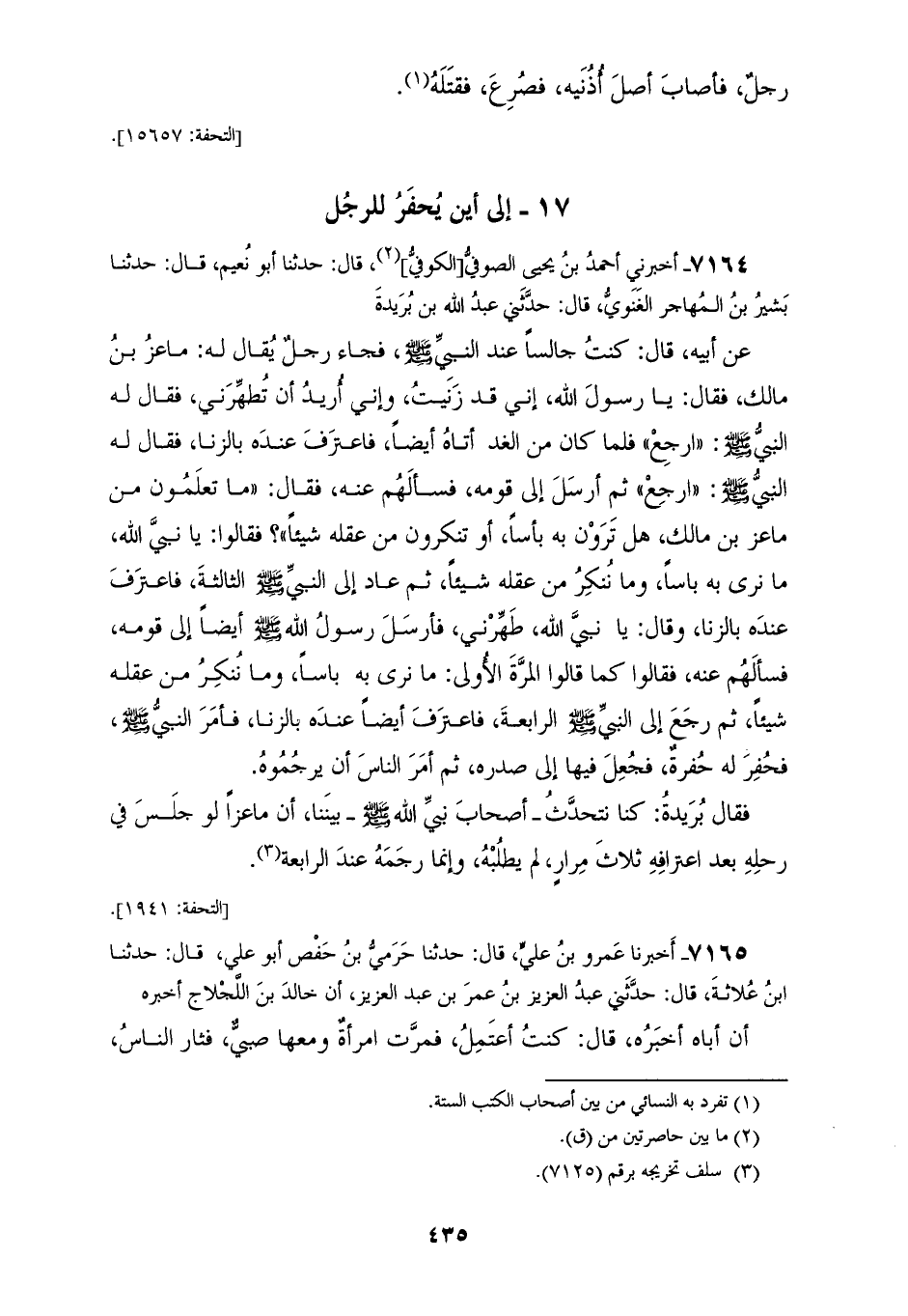 7164 - أَخْبَرَنِي أَحْمَدُ بْنُ يَحْيَى الصُّوفِيُّ الْكُوفِيُّ، قَالَ: حَدَّثَنَا أَبُو نُعَيْمٍ، قَالَ: حَدَّثَنَا بَشِيرُ بْنُ الْمُهَاجِرِ الْغَنَوِيُّ، قَالَ: حَدَّثَنِي عَبْدُ اللهِ بْنُ بُرَيْدَةَ، عَنْ أَبِيهِ، قَالَ: كُنْتُ جَالِسًا عِنْدَ النَّبِيِّ صَلَّى اللهُ عَلَيْهِ وَسَلَّمَ، فَجَاءَ رَجُلٌ يُقَالُ لَهُ مَاعِزُ بْنُ مَالِكٍ، فَقَالَ: يَا رَسُولَ اللهِ، إِنِّي قَدْ زَنَيْتُ وَإِنِّي أُرِيدُ أَنْ تُطَهِّرَنِي فَقَالَ لَهُ النَّبِيُّ صَلَّى اللهُ عَلَيْهِ وَسَلَّمَ: «ارْجِعْ» فَلَمَّا كَانَ مِنَ الْغَدِ أَتَاهُ أَيْضًا فَاعْتَرَفَ عِنْدَهُ بِالزِّنَا فَقَالَ لَهُ النَّبِيُّ صَلَّى اللهُ عَلَيْهِ وَسَلَّمَ: «ارْجِعْ» ثُمَّ أَرْسَلَ إِلَى قَوْمِهِ فَسَأَلَهُمْ عَنْهُ فَقَالَ: «مَا تَعْلَمُونَ مِنْ مَاعِزِ بْنِ مَالِكٍ؟ هَلْ تَرَوْنَ بِهِ بَأْسًا أَوْ تُنْكِرُونَ فِي عَقْلِهِ شَيْئًا؟» فَقَالُوا: يَا نَبِيَّ اللهِ مَا نَرَى بِهِ بَأْسًا وَمَا نُنْكِرُ مِنْ عَقْلِهِ شَيْئًا ثُمَّ عَادَ إِلَى النَّبِيِّ صَلَّى اللهُ عَلَيْهِ وَسَلَّمَ الثَّالِثَةَ فَاعْتَرَفَ عِنْدَهُ بِالزِّنَا، وَقَالَ: يَا نَبِيَّ اللهِ طَهِّرْنِي فَأَرْسَلَ رَسُولُ اللهِ صَلَّى اللهُ عَلَيْهِ وَسَلَّمَ، أَيْضًا إِلَى قَوْمِهِ فَسَأَلَهُمْ عَنْهُ فَقَالُوا: كَمَا قَالُوا الْمَرَّةَ الْأُولَى: مَا نَرَى بِهِ بَأْسًا وَمَا نُنْكِرُ مِنْ عَقْلِهِ شَيْئًا، ثُمَّ رَجَعَ إِلَى النَّبِيِّ صَلَّى اللهُ عَلَيْهِ وَسَلَّمَ الرَّابِعَةَ فَاعْتَرَفَ أَيْضًا عِنْدَهُ بِالزِّنَا، فَأَمَرَ النَّبِيُّ صَلَّى اللهُ عَلَيْهِ وَسَلَّمَ: «§فَحُفِرَ لَهُ حُفْرَةٌ فَجُعِلَ فِيهَا إِلَى صَدْرِهِ ثُمَّ أَمَرَ النَّاسَ أَنْ يَرْجُمُوهُ» فَقَالَ بُرَيْدَةُ: كُنَّا نَتَحَدَّثُ أَصْحَابَ نَبِيِّ اللهِ صَلَّى اللهُ عَلَيْهِ وَسَلَّمَ بَيْنَنَا أَنَّ مَاعِزًا، لَوْ جَلَسَ فِي رَحْلِهِ بَعْدَ اعْتِرَافِهِ ثَلَاثَ مِرَارٍ، وَلَمْ يَطْلُبْهُ وَإِنَّمَا رَجَمَهُ عِنْدَ الرَّابِعَةِ