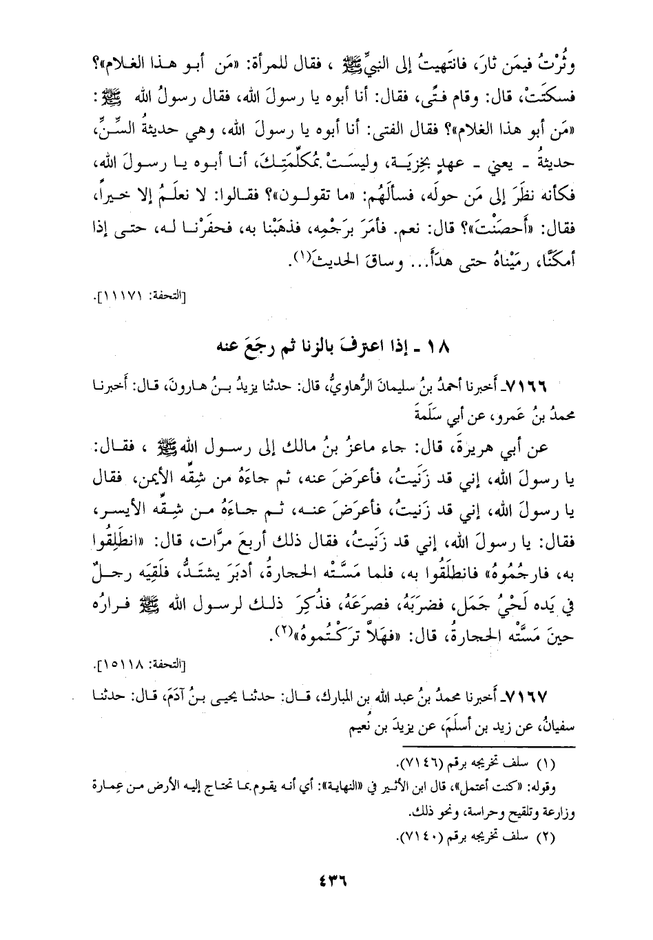 7166 - أَخْبَرَنَا أَحْمَدُ بْنُ سُلَيْمَانَ الرُّهَاوِيُّ، قَالَ: حَدَّثَنَا يَزِيدُ بْنُ هَارُونَ، قَالَ: أَخْبَرَنَا مُحَمَّدُ بْنُ عَمْرٍو، عَنْ أَبِي سَلَمَةَ، عَنْ أَبِي هُرَيْرَةَ، قَالَ: جَاءَ مَاعِزُ بْنُ مَالِكٍ إِلَى رَسُولِ اللهِ صَلَّى اللهُ عَلَيْهِ وَسَلَّمَ فَقَالَ: يَا رَسُولَ اللهِ، إِنِّي قَدْ زَنَيْتُ فَأَعْرَضَ عَنْهُ ثُمَّ جَاءَهُ مِنْ شِقِّهِ الْأَيْمَنِ فَقَالَ: يَا رَسُولَ اللهِ، إِنِّي قَدْ زَنَيْتُ فَأَعْرَضَ عَنْهُ ثُمَّ جَاءَهُ مِنْ شِقِّهِ الْأَيْسَرِ فَقَالَ: يَا رَسُولَ اللهِ، إِنِّي قَدْ زَنَيْتُ فَقَالَ ذَلِكَ أَرْبَعَ مَرَّاتٍ قَالَ: «§انْطَلِقُوا بِهِ فَارْجُمُوهُ» فَانْطَلَقُوا بِهِ فَلَمَّا مَسَّتْهُ الْحِجَارَةُ أَدْبَرَ يَشْتَدُّ فَلَقِيَهُ رَجُلٌ فِي يَدِهِ لِحْيُ جَمَلٍ فَضَرَبَهُ فَصَرَعَهُ، فَذُكِرَ ذَلِكَ لِرَسُولِ اللهِ صَلَّى اللهُ عَلَيْهِ وَسَلَّمَ فِرَارُهُ حِينَ مَسَّتْهُ الْحِجَارَةُ قَالَ: «فَهَلَّا تَرَكْتُمُوهُ»