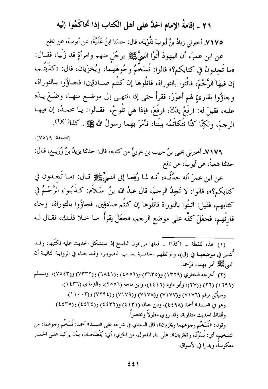 7176 - أَخْبَرَنِي يَحْيَى بْنُ حَبِيبِ بْنِ عَرَبِيٍّ مِنْ كِتَابِهِ قَالَ: حَدَّثَنَا يَزِيدُ بْنُ زُرَيْعٍ، قَالَ: حَدَّثَنَا شُعْبَةُ، عَنْ أَيُّوبَ، عَنْ نَافِعٍ، عَنِ ابْنِ عُمَرَ، أَنَّهُ حَدَّثَهُ أَنَّهُ، لَمَّا رُفِعَا إِلَى النَّبِيِّ صَلَّى اللهُ عَلَيْهِ وَسَلَّمَ قَالَ: «مَا تَجِدُونَ فِي كِتَابِكُمْ؟» قَالُوا: لَا نَجِدُ الرَّجْمَ قَالَ عَبْدُ اللهِ بْنُ سَلَامٍ: كَذَبُوا الرَّجْمُ فِي كِتَابِهِمْ فَقِيلَ: ائْتُوا بِالتَّوْرَاةِ فَاتْلُوهَا إِنْ كُنْتُمْ صَادِقِينَ، فَجَاءُوا بِالتَّوْرَاةِ وَجَاءَ قَارِئِهُمْ فَجَعَلَ كَفَّهُ عَلَى مَوْضِعِ الرَّجْمِ، فَجَعَلَ يَقْرَأُ مَا خَلَا ذَلِكَ فَقَالَ لَهُ عَبْدُ اللهِ بْنُ سَلَامٍ: «أَزْحِلْ كَفَّكَ، فَإِذَا هُوَ بِالرَّجْمِ يَلُوحُ §فَأَمَرَ رَسُولُ اللهِ صَلَّى اللهُ عَلَيْهِ وَسَلَّمَ بِهِمَا فَرُجِمَا»