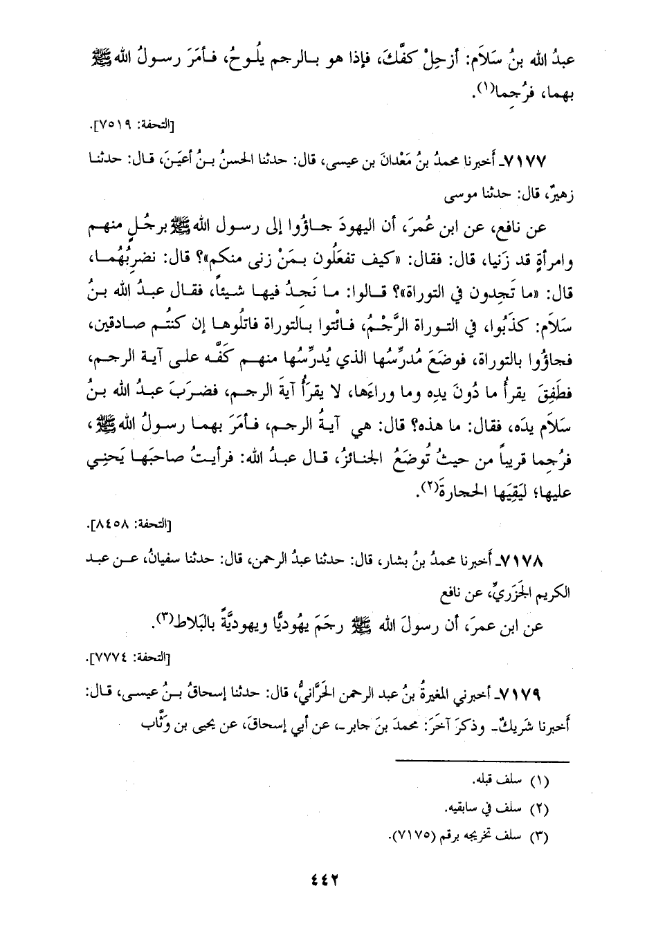 7177 - أَخْبَرَنَا مُحَمَّدُ بْنُ مَعْدَانَ بْنِ عِيسَى، قَالَ: حَدَّثَنَا الْحَسَنُ بْنُ أَعْيَنَ، قَالَ: حَدَّثَنَا زُهَيْرُ، حَدَّثَنَا مُوسَى، عَنْ نَافِعٍ، عَنِ ابْنِ عُمَرَ، أَنَّ الْيَهُودَ، جَاءُوا إِلَى رَسُولِ اللهِ صَلَّى اللهُ عَلَيْهِ وَسَلَّمَ بِرَجُلٍ مِنْهُمْ وَامْرَأَةٍ قَدْ زَنَيَا قَالَ: فَقَالَ: «كَيْفَ تَفْعَلُونَ بِمَنْ زَنَا مِنْكُمْ؟» قَالَ: نَضْرِبُهُمَا قَالَ: «مَا تَجِدُونَ فِي التَّوْرَاةِ؟» قَالُوا: مَا نَجِدُ فِيهَا شَيْئًا فَقَالَ عَبْدُ اللهِ بْنُ سَلَامٍ، كَذَبُوا فِي التَّوْرَاةِ الرَّجْمُ فَائْتُوا بِالتَّوْرَاةِ فَاتْلُوهَا إِنْ كُنْتُمْ صَادِقِينَ، فَجَاءُوا بِالتَّوْرَاةِ فَوَضَعَ مُدَرِّسُهَا الَّذِي يُدَرِّسُهَا مِنْهُمْ كَفَّهُ عَلَى آيَةِ الرَّجْمِ فَطَفِقَ يَقْرَأُ مَا دُونَ يَدِهِ وَمَا وَرَاءَهَا لَا يَقْرَأُ آيَةَ الرَّجْمِ فَضَرَبَ عَبْدُ اللهِ بْنُ سَلَامٍ يَدَهُ فَقَالَ: مَا هَذِهِ؟ قَالَ: هِيَ آيَةُ الرَّجْمِ §فَأَمَرَ بِهِمَا رَسُولُ اللهِ صَلَّى اللهُ عَلَيْهِ وَسَلَّمَ، فَرُجِمَا قَرِيبًا مِنْ حَيْثُ تُوضَعُ الْجَنَائِزُ " قَالَ عَبْدُ اللهِ: فَرَأَيْتُ صَاحِبَهَا يَحْنِي عَلَيْهَا لِيَقِيَهَا الْحِجَارَةَ