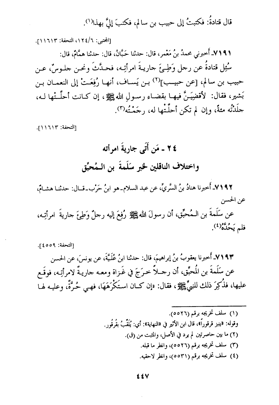 7192 - أَخْبَرَنَا هَنَّادُ بْنُ السَّرِيِّ، عَنْ عَبْدِ السَّلَامِ هُوَ ابْنُ حَرْبٍ، قَالَ: حَدَّثَنَا هِشَامٌ، عَنِ الْحَسَنِ، عَنْ سَلَمَةَ بْنِ الْمُحَبَّقِ: «أَنَّ §رَسُولَ اللهِ صَلَّى اللهُ عَلَيْهِ وَسَلَّمَ رُفِعَ إِلَيْهِ رَجُلٌ وَطِئَ جَارِيَةَ امْرَأَتِهِ فَلَمْ يُحِدَّهُ»
