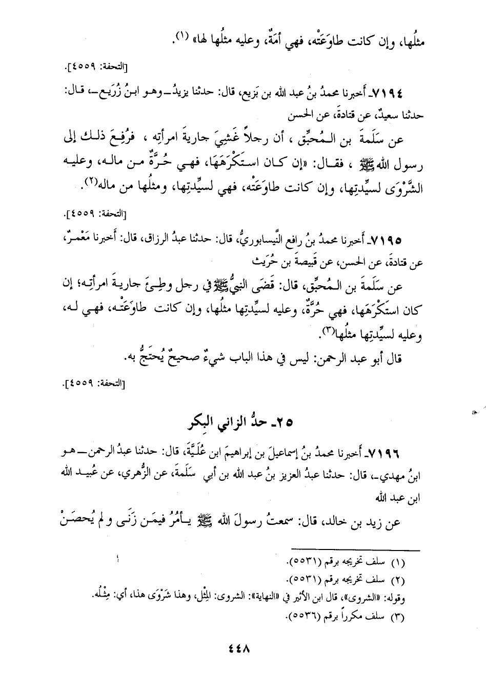 7196 - أَخْبَرَنَا مُحَمَّدُ بْنُ إِسْمَاعِيلَ بْنِ إِبْرَاهِيمَ ابْنِ عُلَيَّةَ، قَالَ: حَدَّثَنَا عَبْدُ الرَّحْمَنِ هُوَ ابْنُ مَهْدِيٍّ، قَالَ: حَدَّثَنَا عَبْدُ الْعَزِيزِ بْنُ عَبْدِ اللهِ بْنِ أَبِي سَلَمَةَ، عَنِ الزُّهْرِيِّ، عَنْ عُبَيْدِ اللهِ بْنِ عَبْدِ اللهِ، عَنْ زَيْدِ بْنِ خَالِدٍ، قَالَ: سَمِعْتُ رَسُولَ اللهِ صَلَّى اللهُ عَلَيْهِ وَسَلَّمَ: «§يَأْمُرُ فِيمَنْ زَنَا وَلَمْ يُحْصَنْ بِجَلْدِ مِائَةٍ وَتَغْرِيبِ عَامٍ»