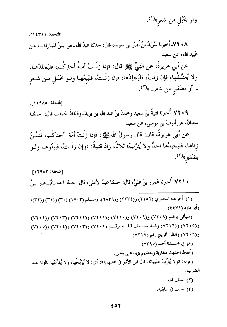 7208 - أَخْبَرَنَا سُوَيْدُ بْنُ نَصْرِ بْنِ سُوَيْدٍ، قَالَ: حَدَّثَنَا عَبْدُ اللهِ هُوَ ابْنُ الْمُبَارَكِ، عَنْ عُبَيْدِ اللهِ، عَنْ سَعِيدٍ، عَنْ أَبِي هُرَيْرَةَ، عَنِ النَّبِيِّ صَلَّى اللهُ عَلَيْهِ وَسَلَّمَ قَالَ: «§إِذَا زَنَتْ أَمَةُ أَحَدِكُمْ فَلْيَجْلِدْهَا، وَلَا يُعَنِّفْهَا، فَإِنْ زَنَتْ فَلْيَجْلِدْهَا، فَإِنْ زَنَتْ فَلْيَبِعْهَا، وَلَوْ بِحَبْلٍ مِنْ شَعْرٍ أَوْ بِضَفِيرٍ مِنْ شَعْرٍ»