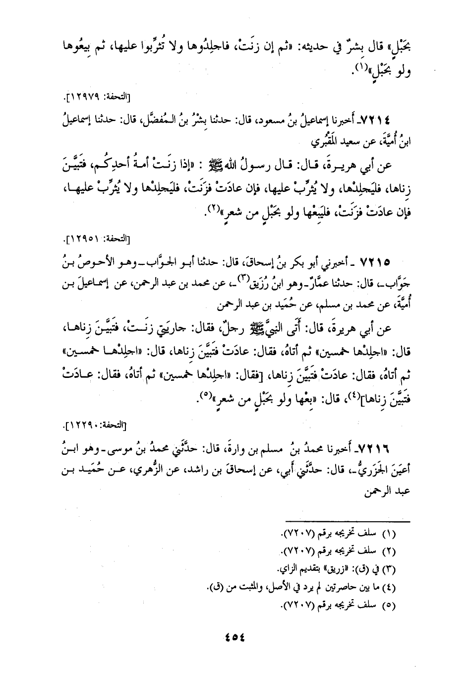 7215 - أَخْبَرَنِي أَبُو بَكْرِ بْنُ إِسْحَاقَ، قَالَ: حَدَّثَنَا أَبُو الْجَوَّابِ وَهُوَ الْأَحْوَصُ بْنُ جَوَابٍ، قَالَ: حَدَّثَنَا عَمَّارٌ وَهُوَ ابْنُ رُزَيْقٍ، عَنْ مُحَمَّدِ بْنِ عَبْدِ الرَّحْمَنِ، عَنْ إِسْمَاعِيلَ بْنِ أُمَيَّةَ، عَنْ مُحَمَّدِ بْنِ مُسْلِمٍ، عَنْ حُمَيْدِ بْنِ عَبْدِ الرَّحْمَنِ، عَنْ أَبِي هُرَيْرَةَ، قَالَ: أَتَى النَّبِيَّ صَلَّى اللهُ عَلَيْهِ وَسَلَّمَ رَجُلٌ فَقَالَ: جَارِيَتِي زَنَتْ فَتَبَيَّنَ زِنَاهَا قَالَ: «§اجْلِدْهَا خَمْسِينَ» ثُمَّ أَتَاهُ فَقَالَ: عَادَتْ فَتَبَيَّنَ زِنَاهَا قَالَ: «اجْلِدْهَا خَمْسِينَ» ثُمَّ أَتَاهُ فَقَالَ: عَادَتْ فَتَبَيَّنَ زِنَاهَا قَالَ: «اجْلِدْهَا خَمْسِينَ» ثُمَّ أَتَاهُ، فَقَالَ: عَادَتْ فَتَبَيَّنَ زِنَاهَا، قَالَ: «بِعْهَا وَلَوْ بِحَبْلٍ مِنْ شَعْرٍ»