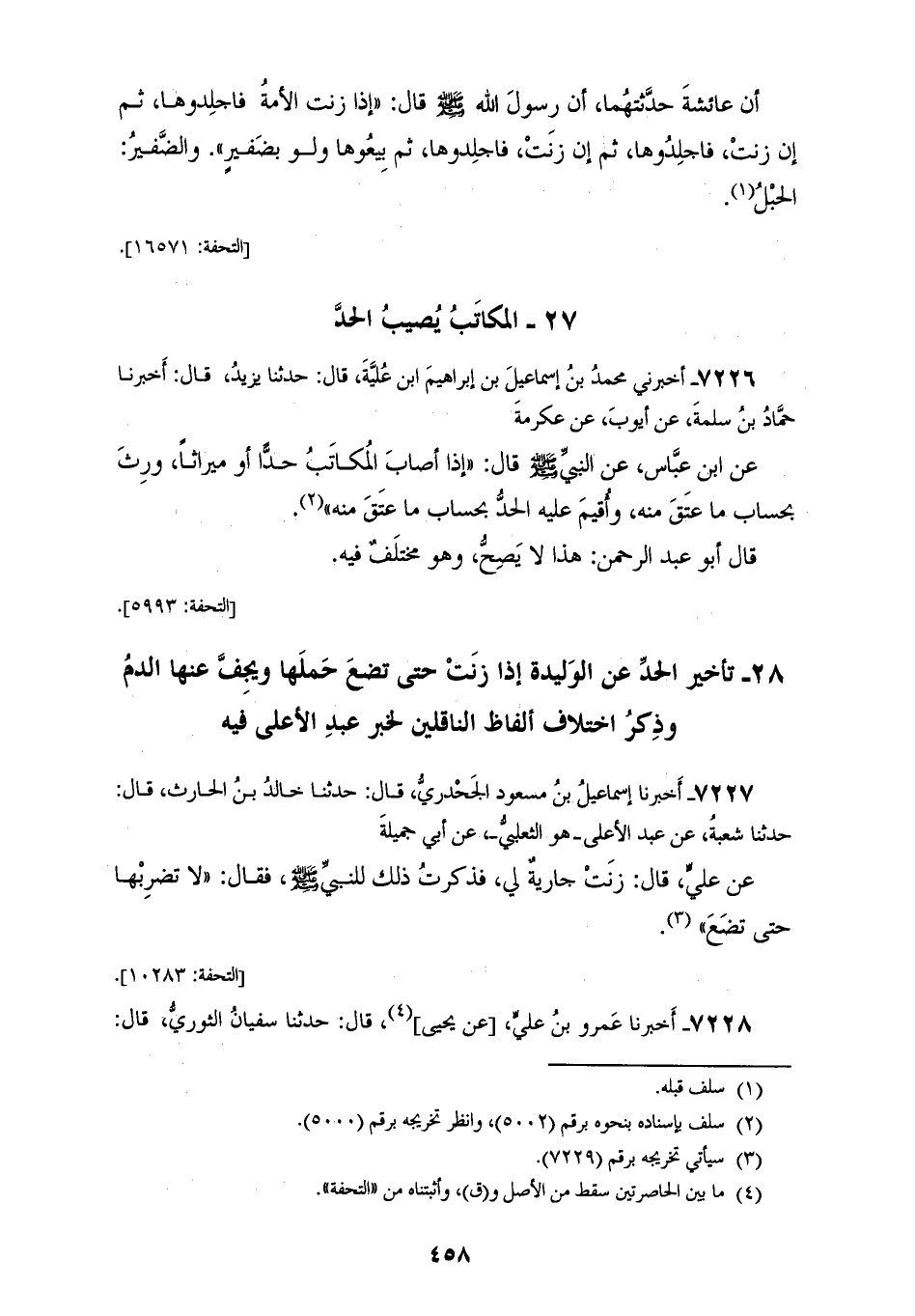 7227 - أَخْبَرَنَا إِسْمَاعِيلُ بْنُ مَسْعُودٍ الْجَحْدَرِيُّ، قَالَ: حَدَّثَنَا خَالِدُ بْنُ الْحَارِثِ، قَالَ: حَدَّثَنَا شُعْبَةُ، عَنْ عَبْدِ الْأَعْلَى هُوَ الثَّعْلَبِيُّ، عَنْ أَبِي جَمِيلَةَ، عَنْ عَلِيٍّ، قَالَ: زَنَتْ جَارِيَةٌ لِي فَذَكَرْتُ ذَلِكَ لِلنَّبِيِّ صَلَّى اللهُ عَلَيْهِ وَسَلَّمَ فَقَالَ: «§لَا تَضْرِبْهَا حَتَّى تَضَعَ»