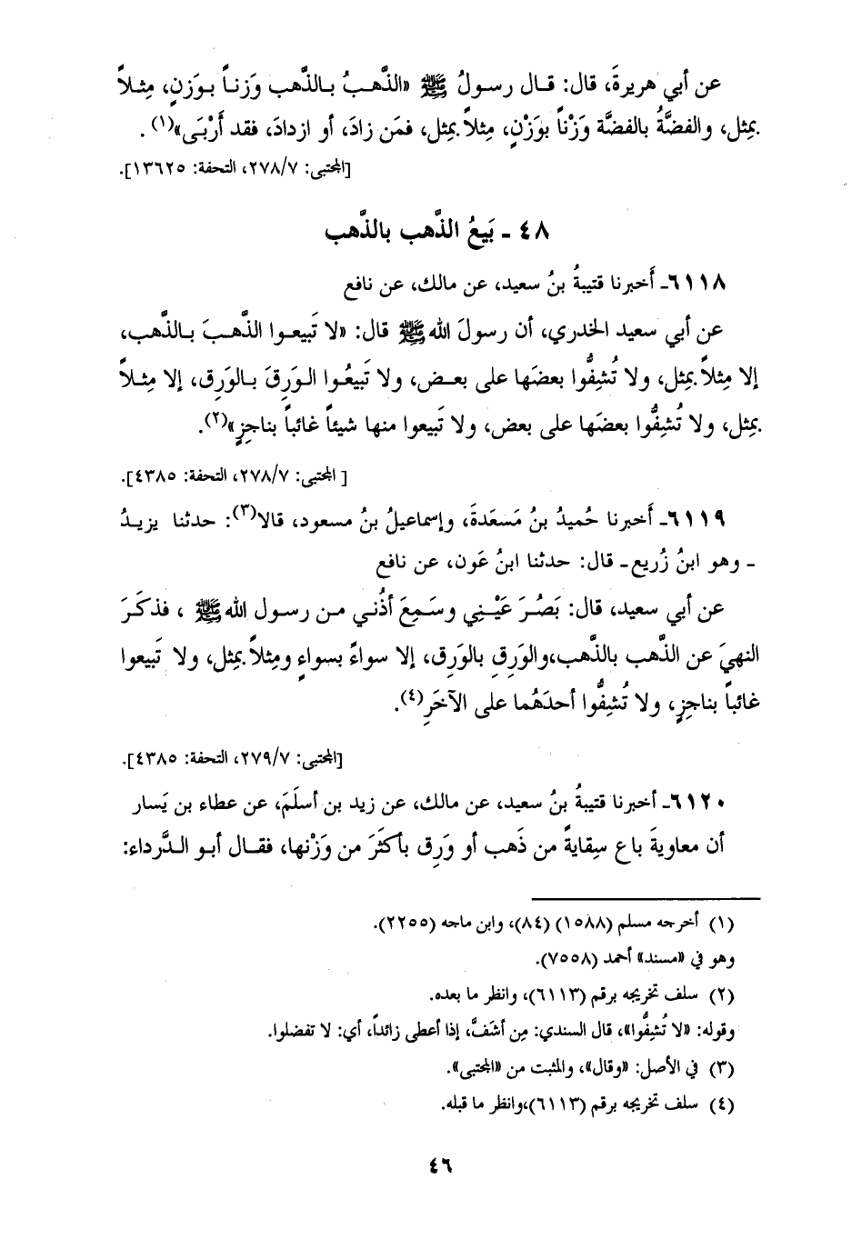 6118 - أَخْبَرَنَا قُتَيْبَةُ بْنُ سَعِيدٍ، عَنْ مَالِكٍ، عَنْ نَافِعٍ، عَنْ أَبِي سَعِيدٍ الْخُدْرِيِّ، أَنَّ رَسُولَ اللهِ صَلَّى اللهُ عَلَيْهِ وَسَلَّمَ قَالَ: «§لَا تَبِيعُوا الذَّهَبَ بِالذَّهَبِ إِلَّا مِثْلًا بِمِثْلٍ، وَلَا تُشِفُّوا بَعْضَهَا عَلَى بَعْضٍ، وَلَا تَبِيعُوا الْوَرِقَ بِالْوَرِقِ إِلَّا مِثْلًا بِمِثْلٍ، وَلَا تُشِفُّوا بَعْضَهَا عَلَى بَعْضٍ، وَلَا تَبِيعُوا مِنْهَا شَيْئًا غَائِبًا بِنَاجِزٍ»