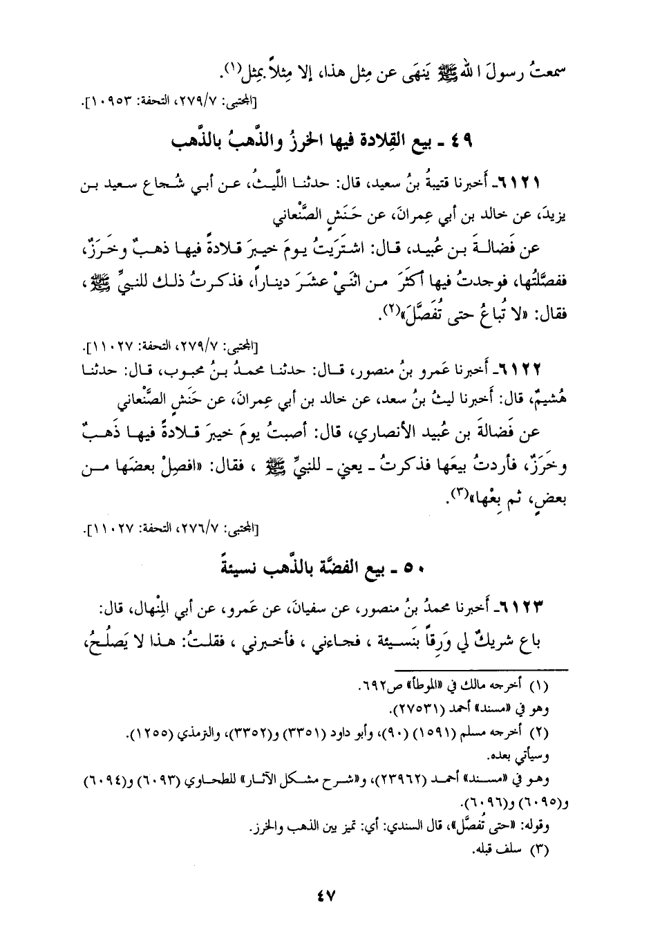 6121 - أَخْبَرَنَا قُتَيْبَةُ بْنُ سَعِيدٍ، قَالَ: حَدَّثَنَا اللَّيْثُ، عَنِ أَبِي شُجَاعٍ سَعِيدِ بْنِ يَزِيدَ، عَنْ خَالِدِ بْنِ أَبِي عِمْرَانَ، عَنْ حَنَشٍ الصَّنْعَانِيِّ، عَنْ فَضَالَةَ بْنِ عُبَيْدٍ، قَالَ: اشْتَرَيْتُ يَوْمَ خَيْبَرَ قِلَادَةً فِيهَا ذَهَبٌ وَخَرَزٌ، فَفَصَّلْتُهَا فَوَجَدْتُ فِيهَا أَكْثَرَ مِنِ اثْنَيْ عَشَرَ دِينَارًا، فَذَكَرْتُ ذَلِكَ لِلنَّبِيِّ صَلَّى اللهُ عَلَيْهِ وَسَلَّمَ، فَقَالَ: «§لَا تُبَاعُ حَتَّى تُفَصَّلَ»