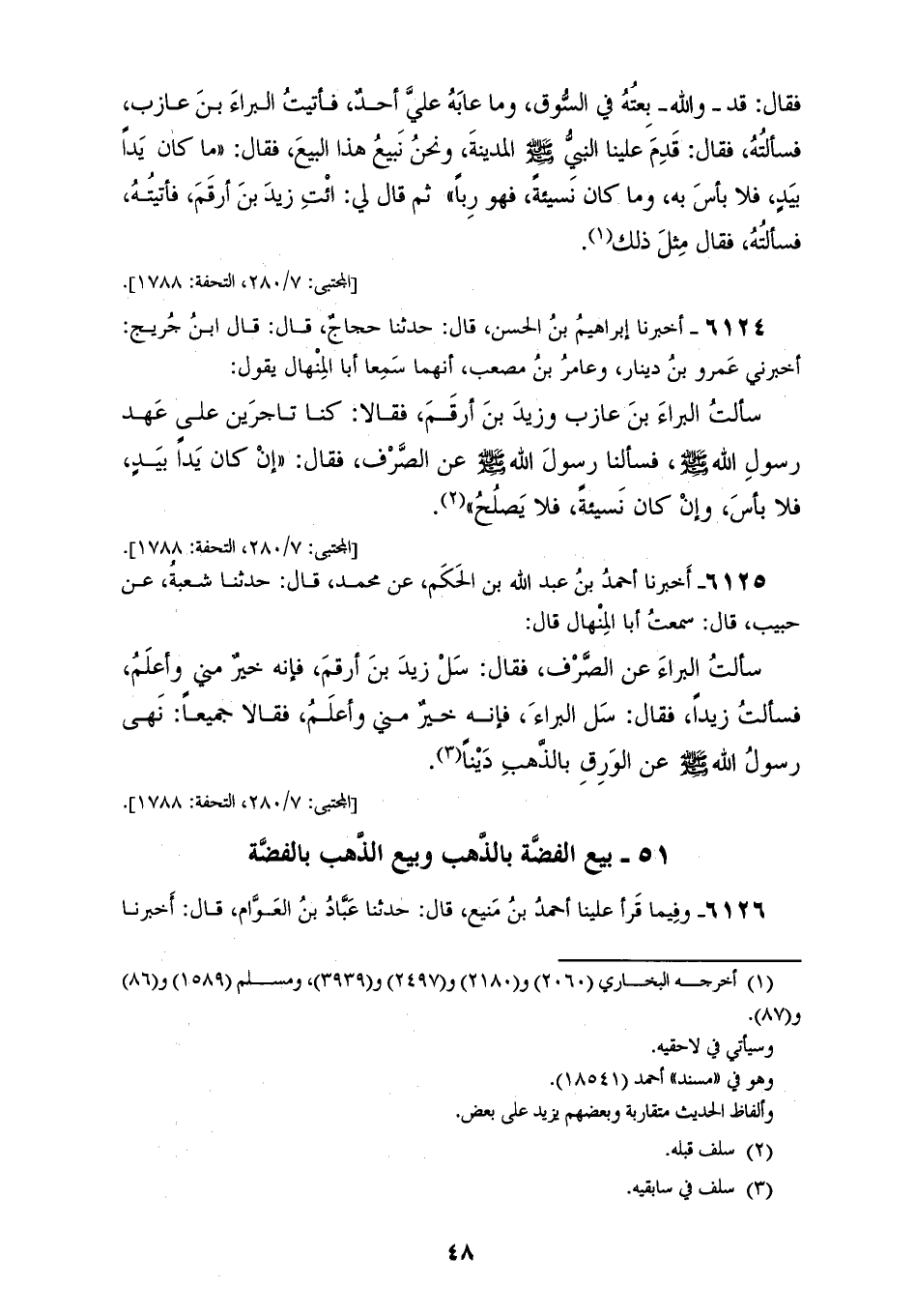 6123 - أَخْبَرَنَا مُحَمَّدُ بْنُ مَنْصُورٍ، عَنْ سُفْيَانَ، عَنْ عَمْرٍو، عَنْ أَبِي الْمِنْهَالِ، قَالَ: بَاعَ شَرِيكٌ لِي وَرِقًا بِنَسِيئَةٍ، فَجَاءَنِي فَأَخْبَرَنِي، فَقُلْتُ: هَذَا لَا يَصْلُحُ، فَقَالَ: قَدْ وَاللهِ بِعْتُهُ فِي السُّوقِ، وَمَا عَابَهُ عَلَيَّ أَحَدٌ، فَأَتَيْتُ الْبَرَاءَ بْنَ عَازِبٍ فَسَأَلْتُهُ، فَقَالَ: قَدِمَ عَلَيْنَا النَّبِيُّ صَلَّى اللهُ عَلَيْهِ وَسَلَّمَ الْمَدِينَةَ وَنَحْنُ نَبِيعُ هَذَا الْبَيْعَ، فَقَالَ: «§مَا كَانَ يَدًا بَيْدٍ فَلَا بَأْسَ بِهِ، وَمَا كَانَ نَسِيئَةً فَهُوَ رَبًّا»، ثُمَّ قَالَ لِي: ائْتِ زَيْدَ بْنَ أَرْقَمَ، فَأَتَيْتُهُ فَسَأَلْتُهُ، فَقَالَ مِثْلَ ذَلِكَ