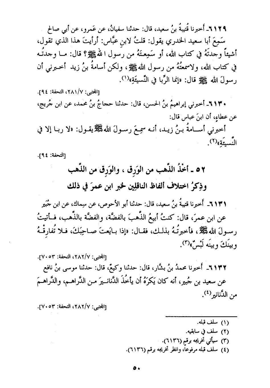 6129 - أَخْبَرَنَا قُتَيْبَةُ بْنُ سَعِيدٍ، قَالَ: حَدَّثَنَا سُفْيَانُ، عَنْ عَمْرٍو، عَنْ أَبِي صَالِحٍ، سَمِعَ أَبَا سَعِيدٍ الْخُدْرِيَّ، يَقُولُ: قُلْتُ لِابْنِ عَبَّاسٍ: أَرَأَيْتَ هَذَا الَّذِي تَقُولُ، أَشَيْئًا وَجَدْتَهُ فِي كِتَابِ اللهِ، أَوْ سَمِعْتَهُ مِنْ رَسُولِ اللهِ صَلَّى اللهُ عَلَيْهِ وَسَلَّمَ؟، قَالَ: مَا وَجَدْتُهُ فِي كِتَابِ اللهِ، وَلَا سَمِعْتُهُ مِنْ رَسُولِ اللهِ صَلَّى اللهُ عَلَيْهِ وَسَلَّمَ، وَلَكِنْ أُسَامَةُ بْنُ زَيْدٍ أَخْبَرَنِي أَنَّ رَسُولَ اللهِ صَلَّى اللهُ عَلَيْهِ وَسَلَّمَ قَالَ: «§إِنَّمَا الرِّبَا فِي النَّسِيئَةِ»